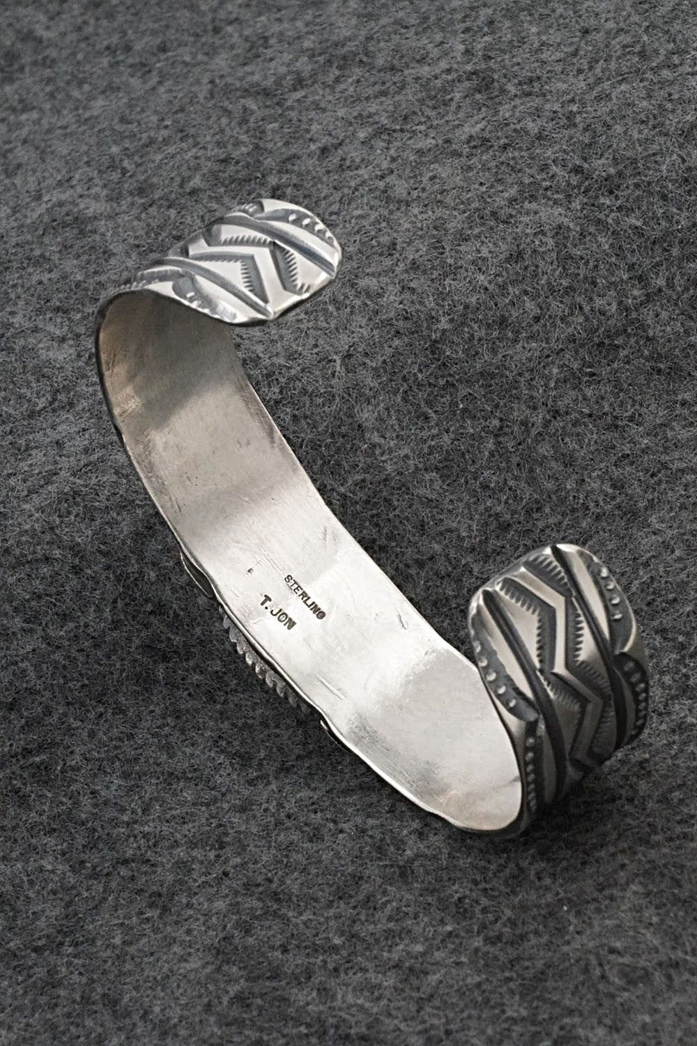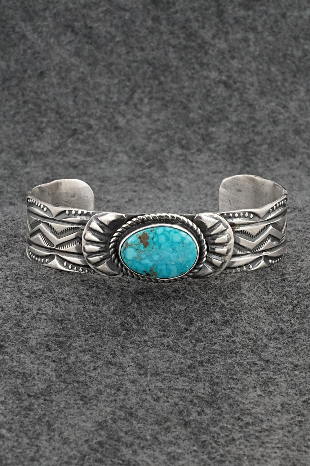 This impressive Blue Ridge turquoise and brushed-finish sterling silver bracelet was made by Navajo silversmith Tillie Jon. The back is signed T.Jon and Sterling.