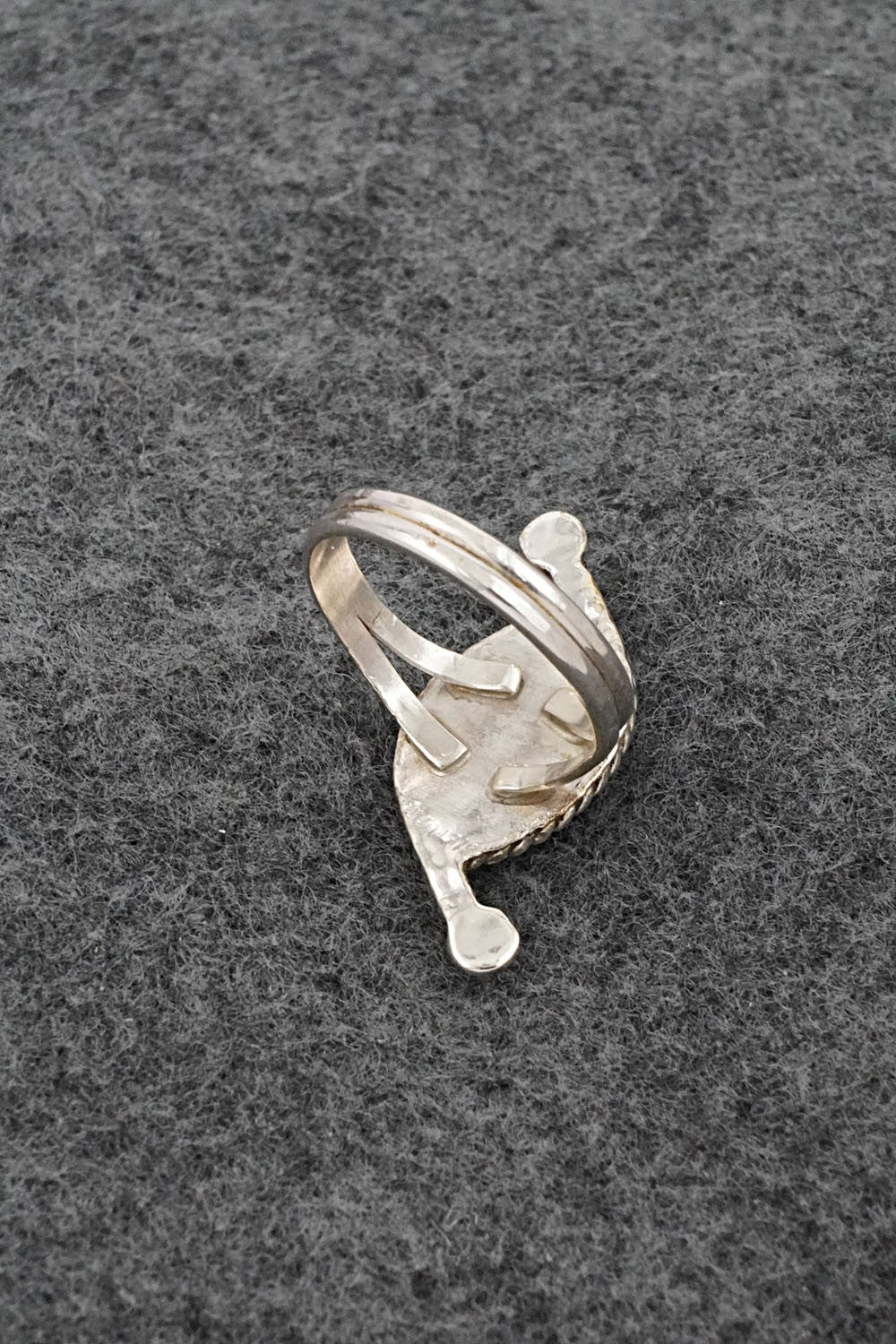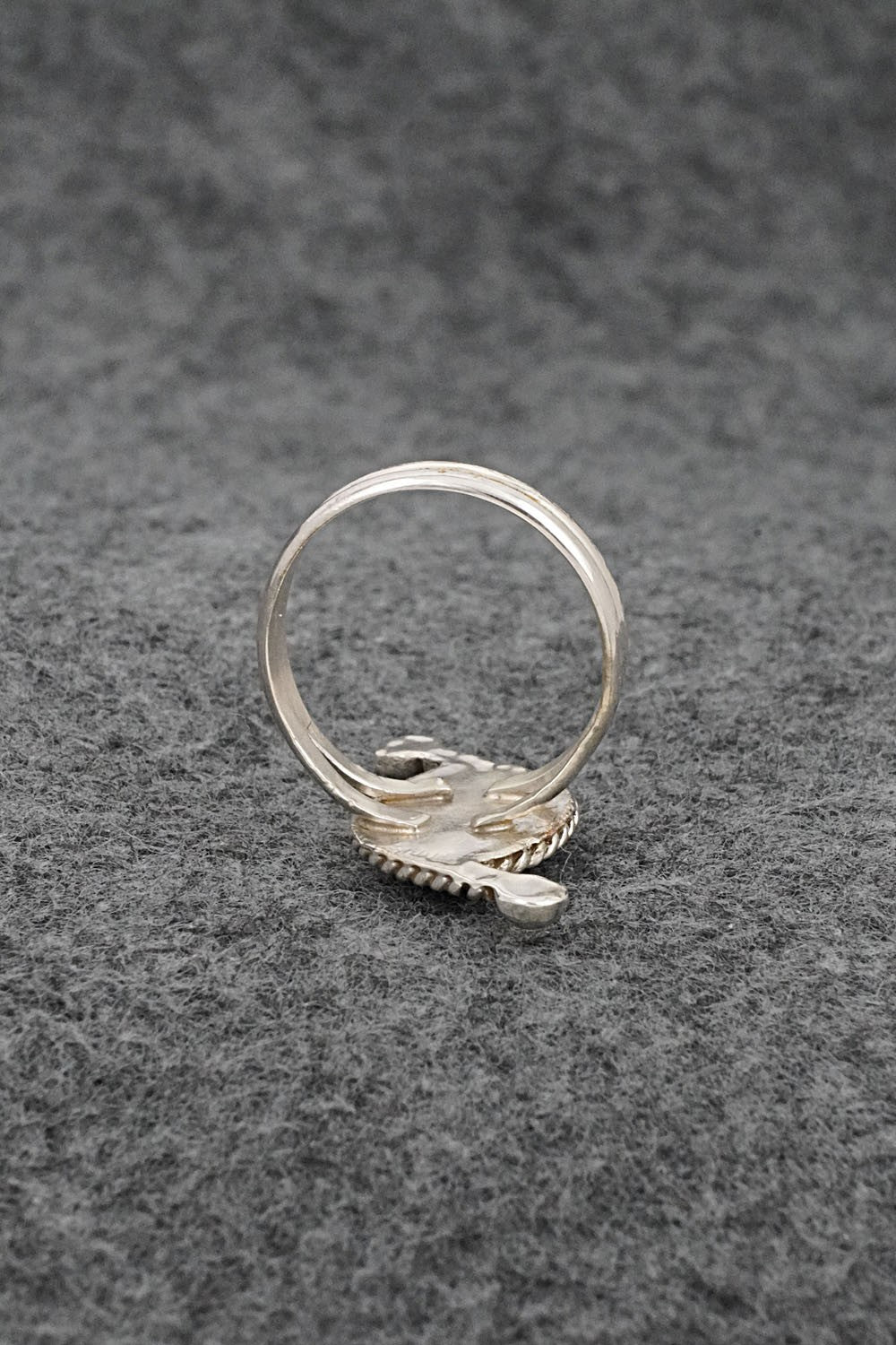 This turquoise and sterling silver inlay ring was made by Zuni silversmith Carlen Seoutewa. The back is stamped sterling.