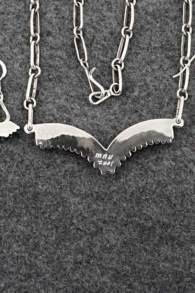 This intricately crafted turquoise and sterling silver necklace and earrings set was made by Zuni silversmith Mildred Ukestine. The back of the necklace is signed.