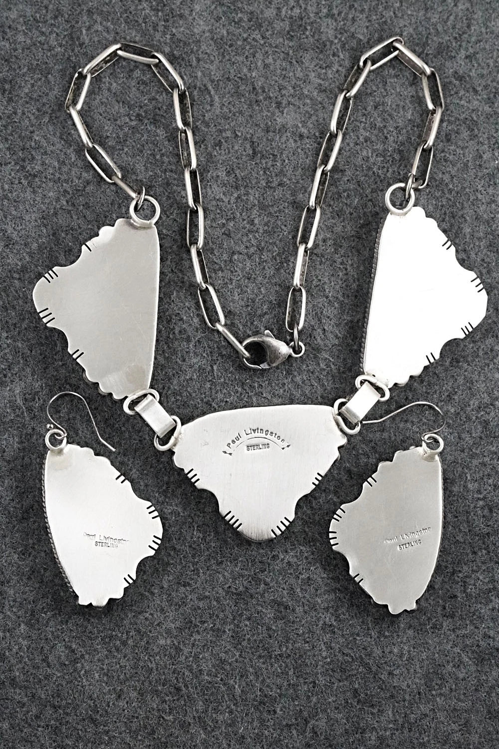 This impressive #8 turquoise and brushed-finish sterling silver necklace and earrings set was made by Navajo silversmith Paul Livingston. The back is signed Paul Livingston and stamped sterling.