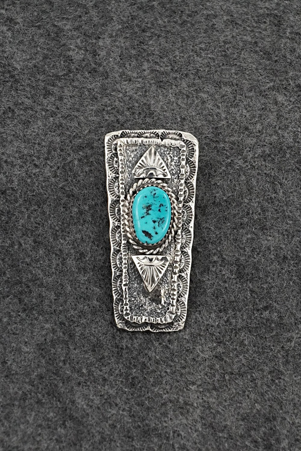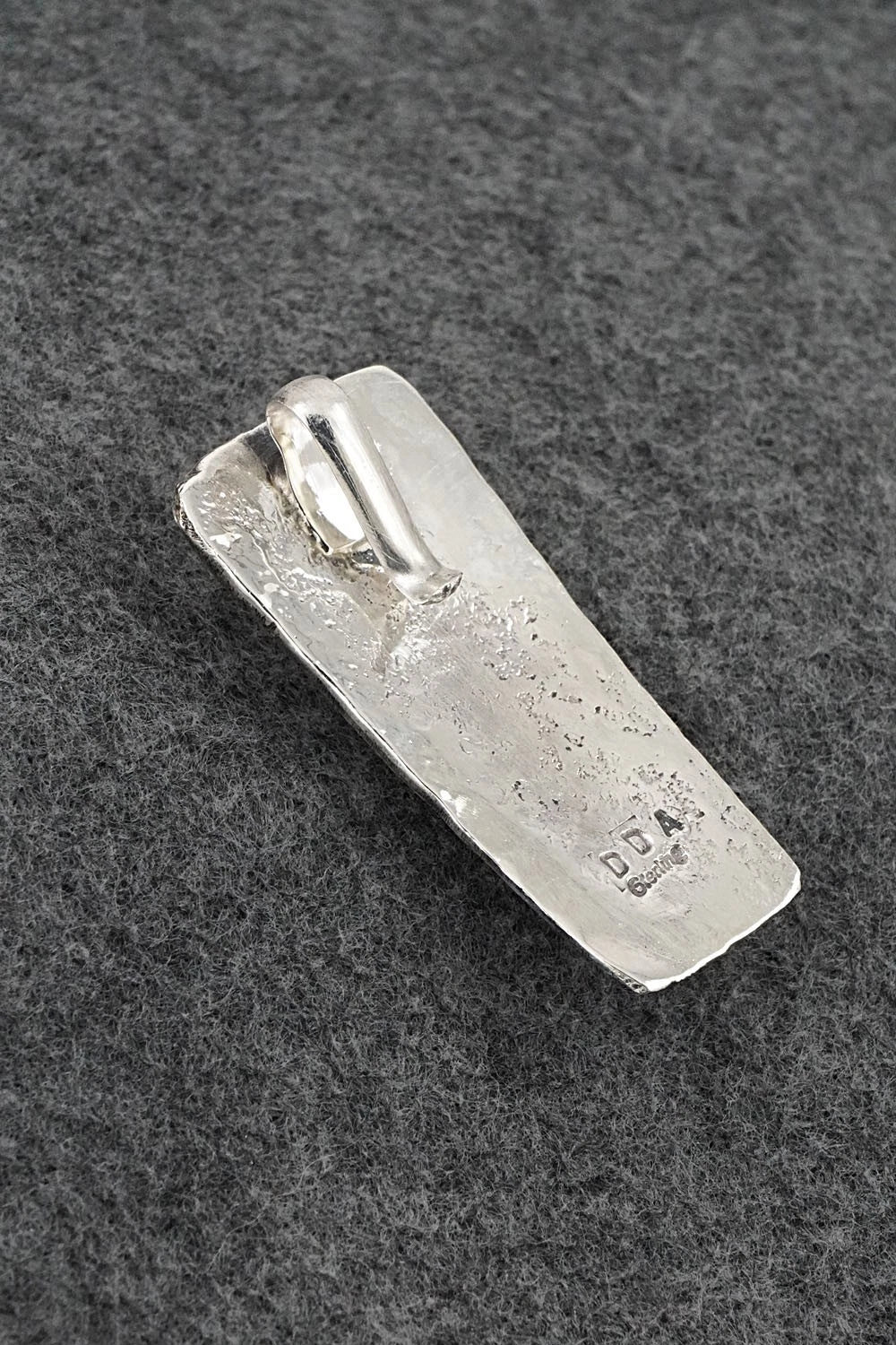 This turquoise and bright-polish sterling silver pendant was made by Navajo silversmith Dymitri Arviso. The back is signed DDA and stamped sterling.