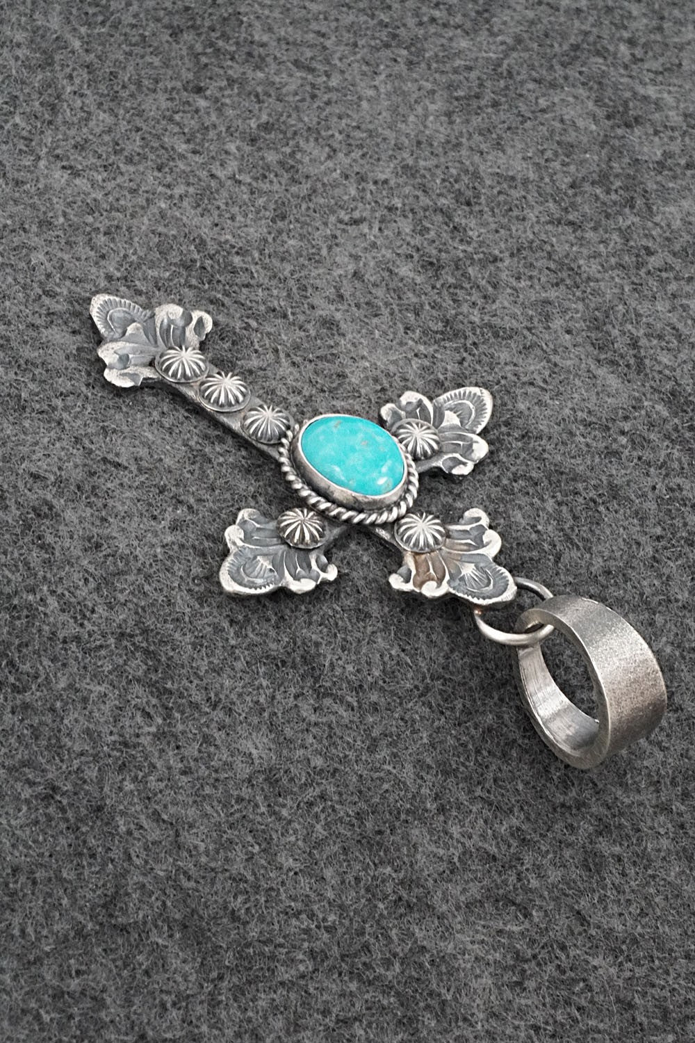This impressive turquoise and brushed-finish sterling silver cross-shaped pendant was made by Navajo silversmith Kevin Billah. The back is signed K. Billah and stamped sterling.