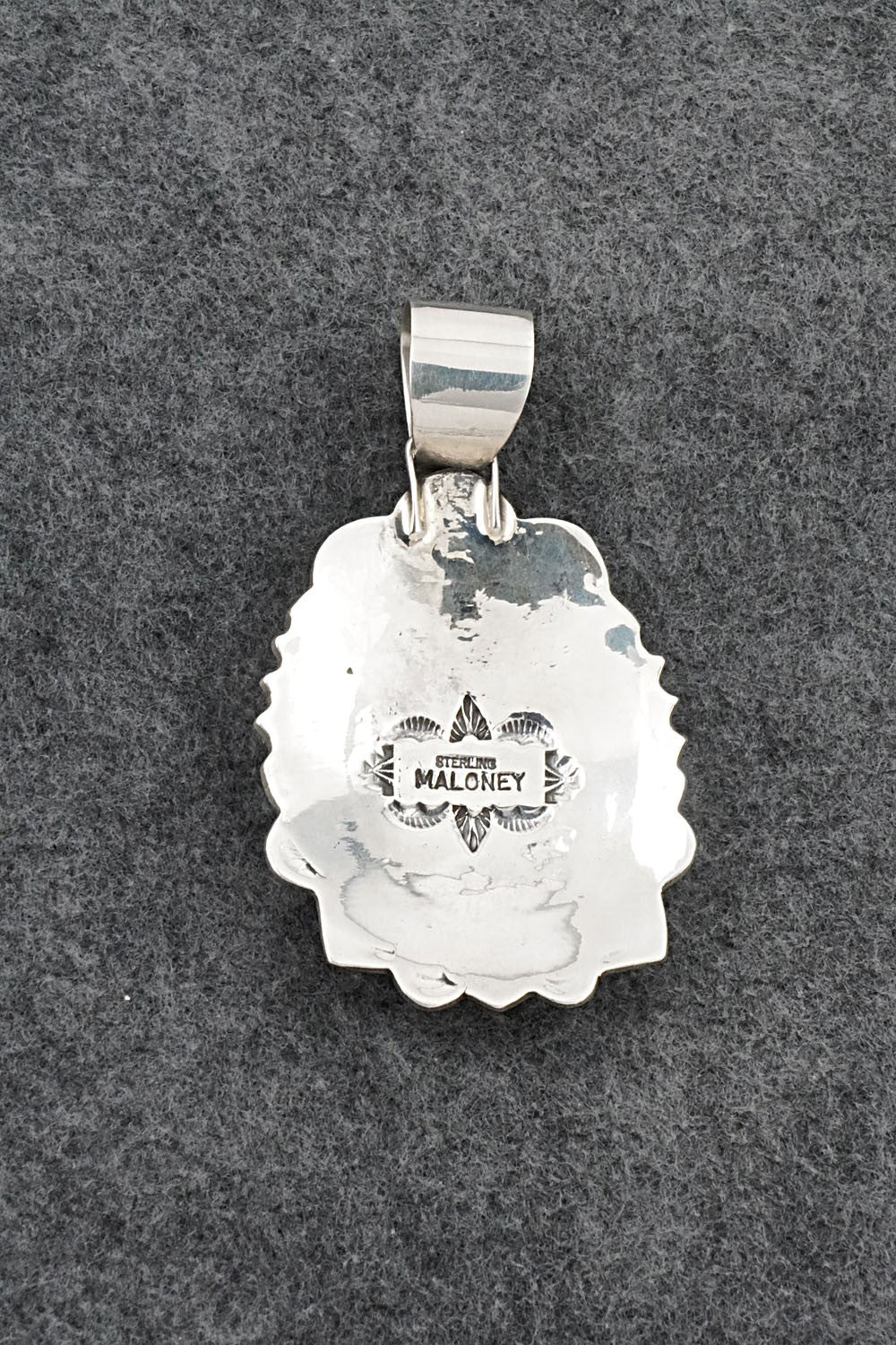 This beautiful Morenci turquoise and bright-polish sterling silver pendant was made by Navajo silversmith Leonard Maloney The back is stamped Maloney and sterling.