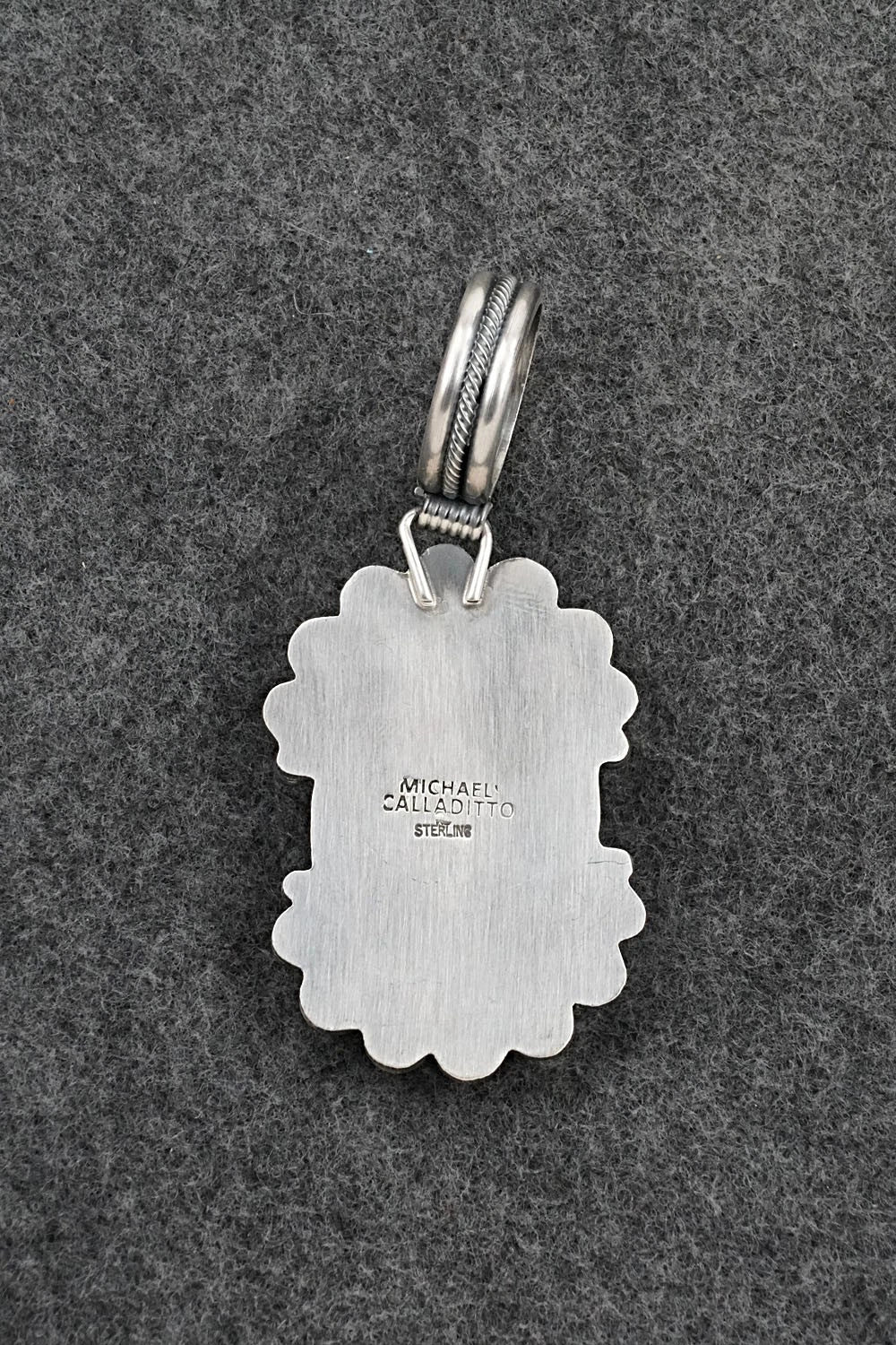 This stunning natural Kingman turquoise and brushed-finish sterling silver pendant was made by Navajo silversmith Michael Calladitto. The back is signed Michael Calladitto and stamped sterling.