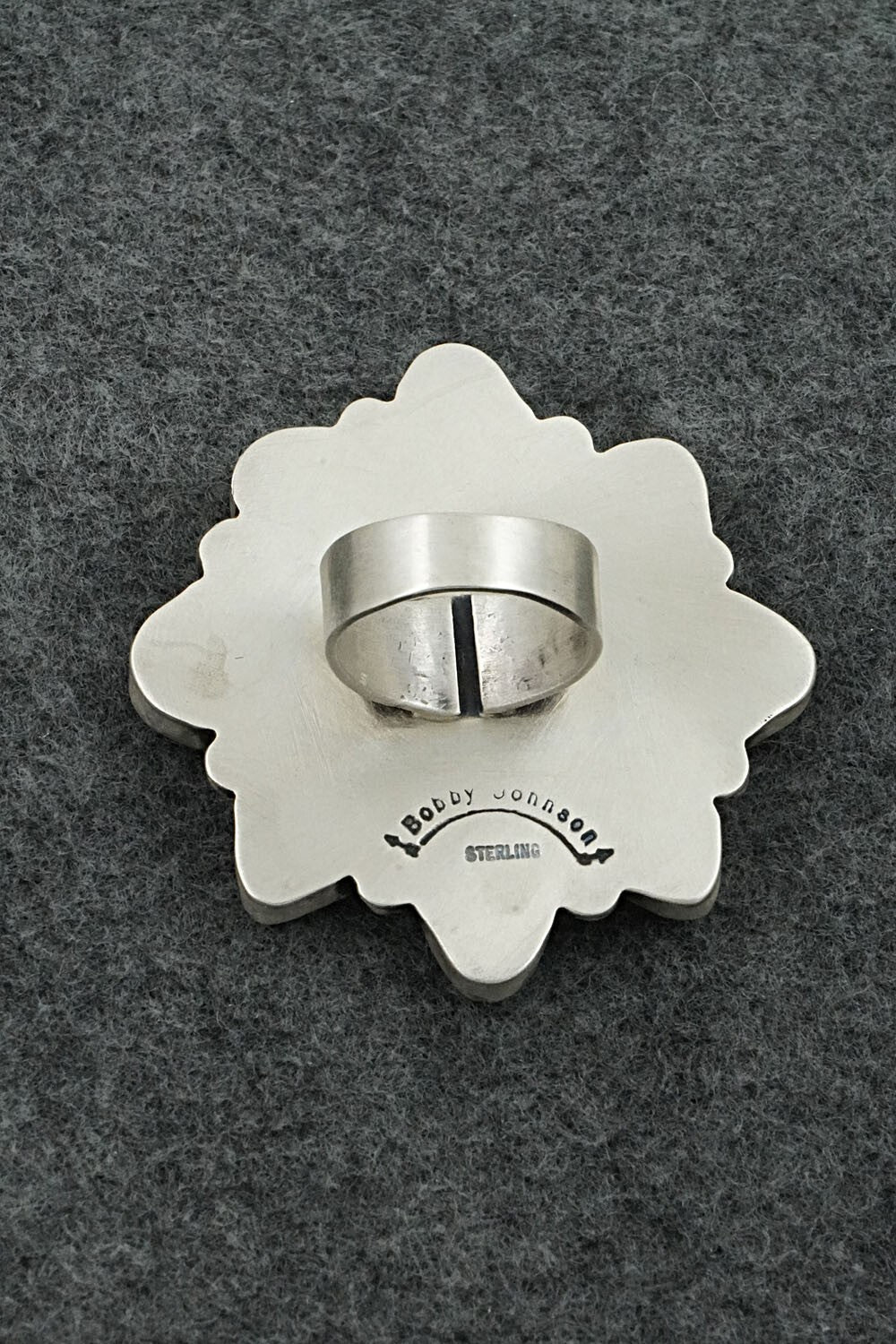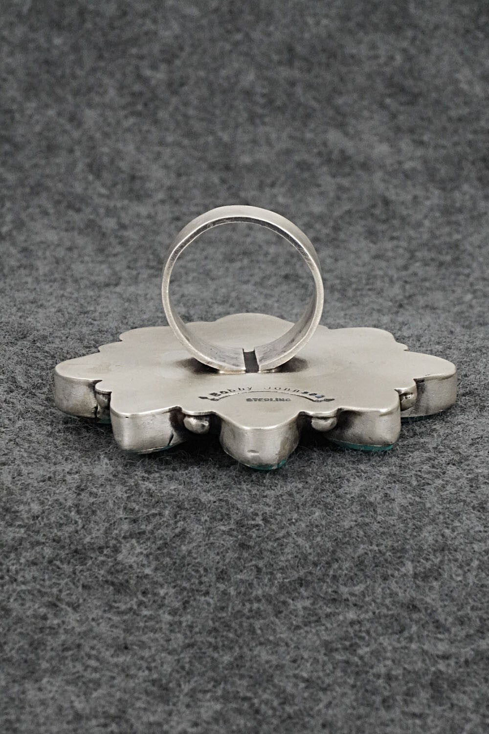 This natural Fox turquoise and brushed-finish sterling silver ring was made by Navajo silversmith Bobby Johnson. The back is signed Bobby Johnson and stamped sterling.