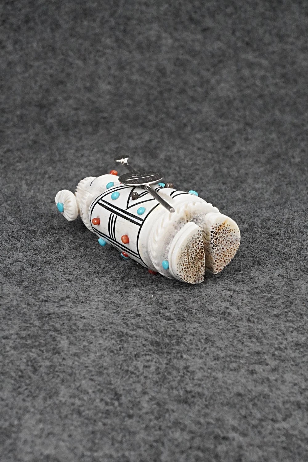 This warrior with metal shield and spear Zuni fetish was carved by Claudia Peina. The bottom is signed CPZ.