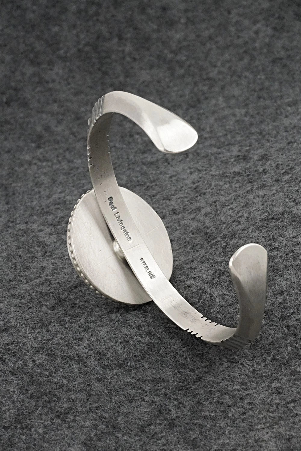 This impressive White Buffalo and brushed-finish sterling silver bracelet was made by Navajo silversmith Paul Livingston. The back is stamped Paul Livingston and sterling.