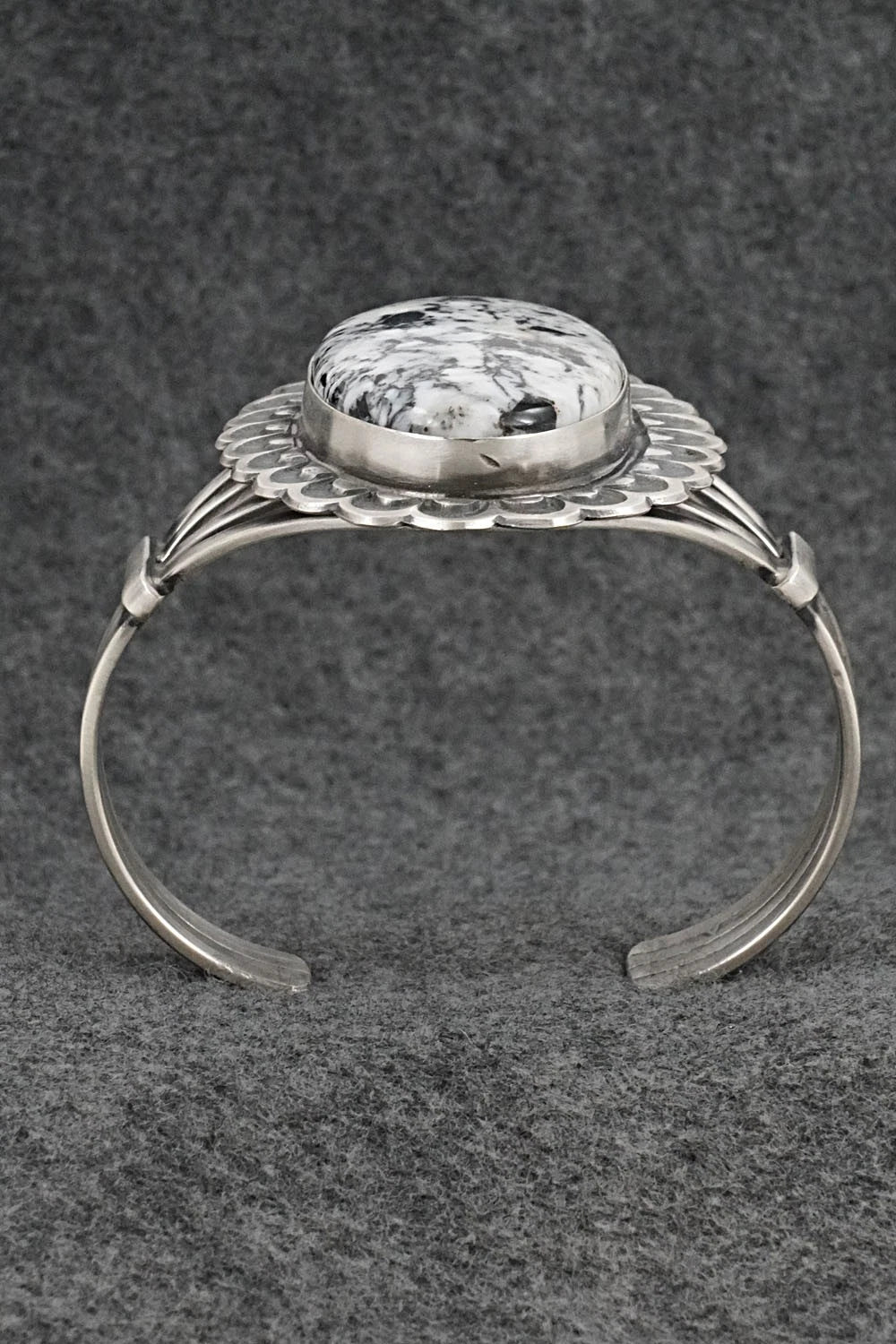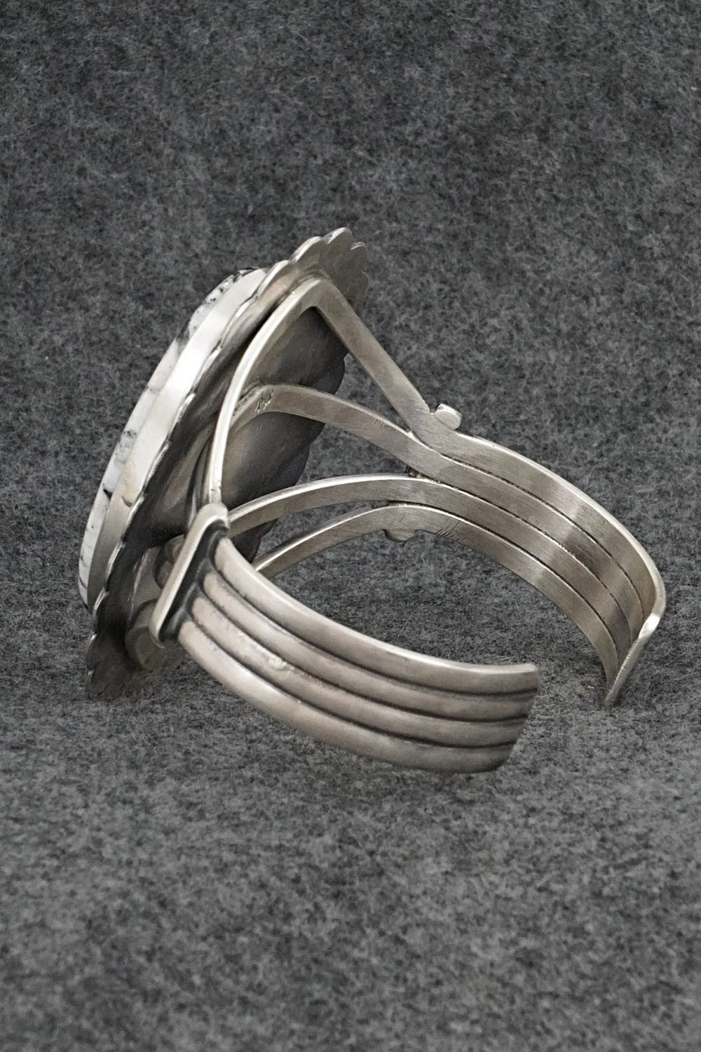 This impressive White Buffalo and brushed-finish sterling silver bracelet was made by Navajo silversmith Randy Boyd. The back is signed RB and stamped sterling.