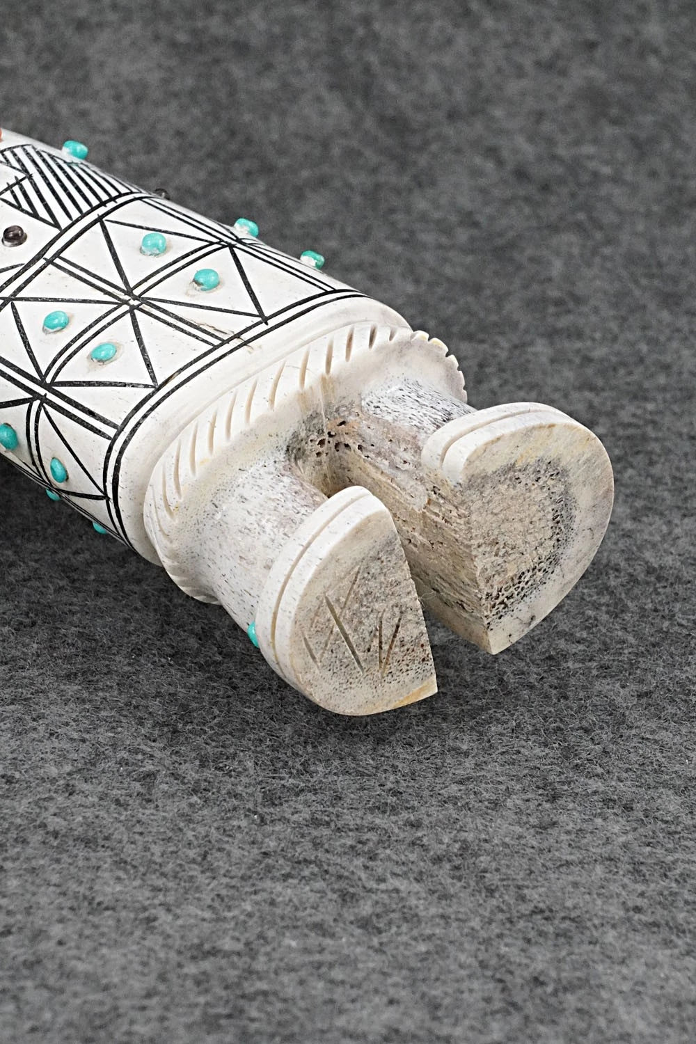 This angel Zuni fetish featuring stamped metal wings was carved by Claudia Peina. The bottom is signed CPZ.