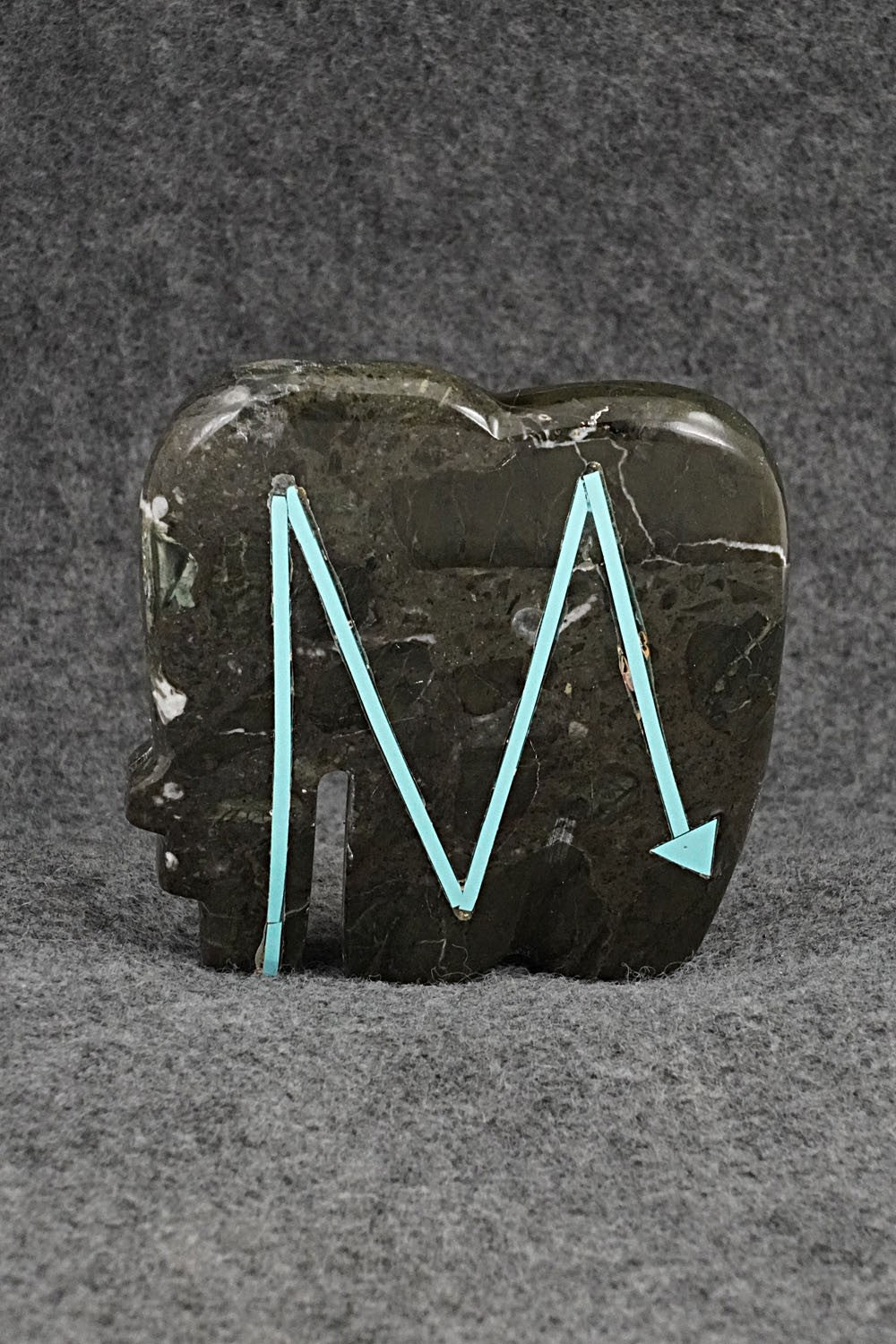 This bear with inlay arrow design Zuni fetish was carved by Bernard Laiwakete. The bottom is signed BL and Zuni.