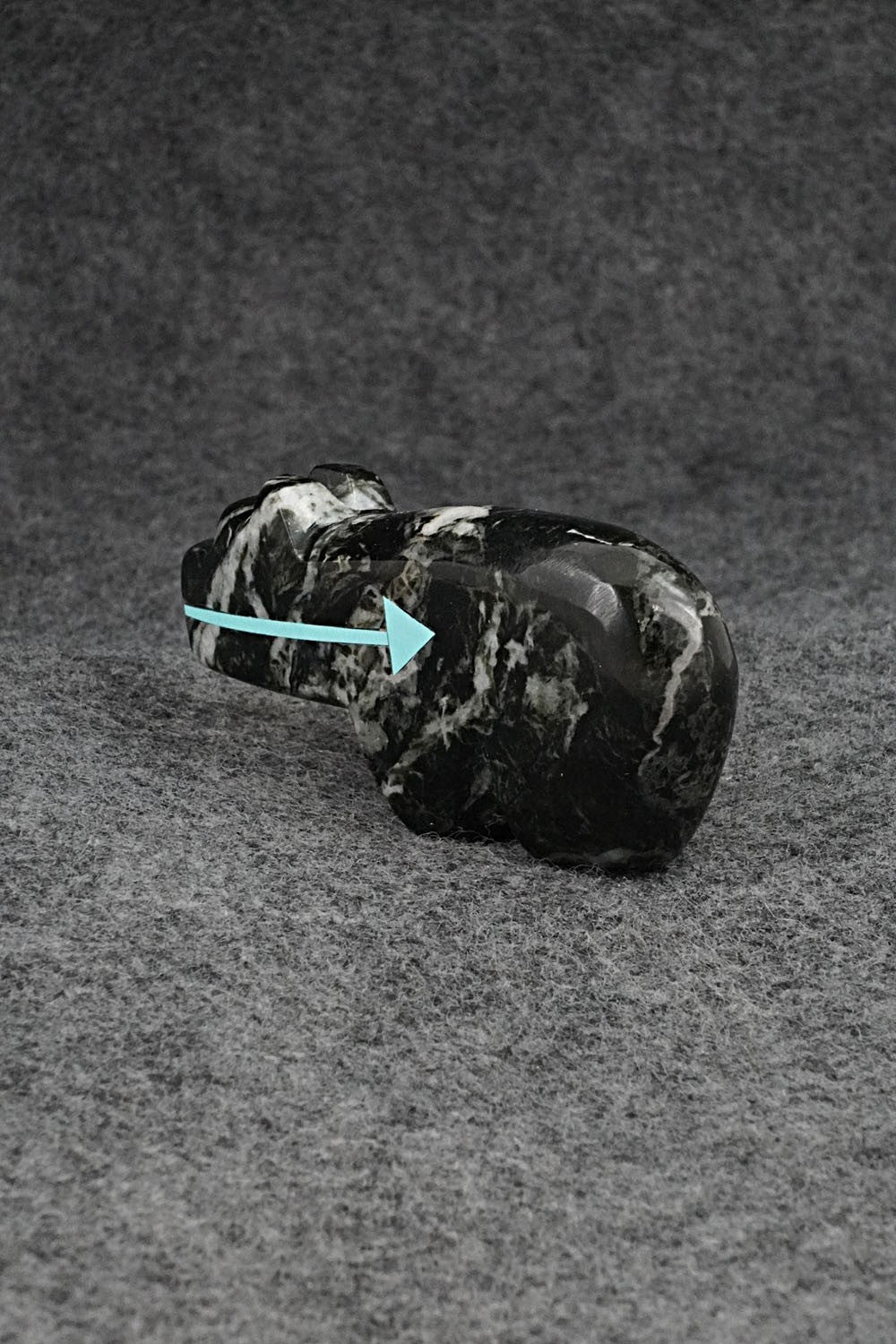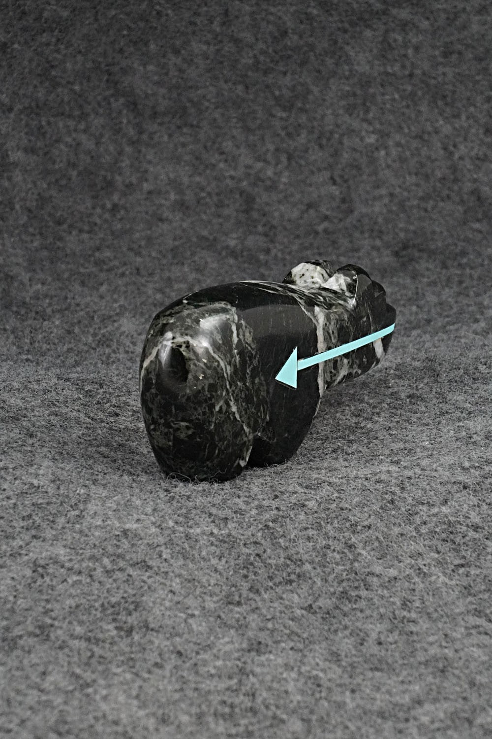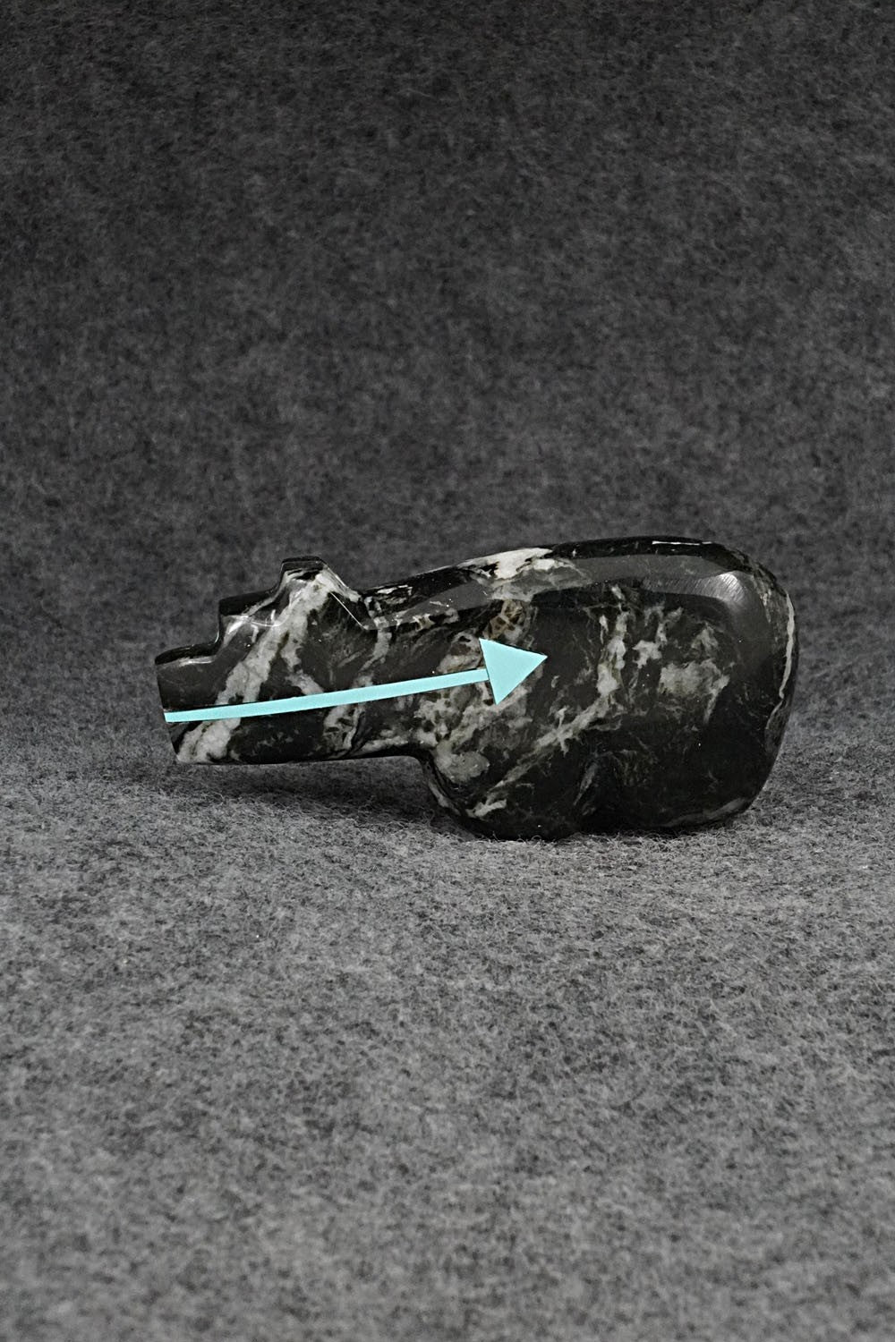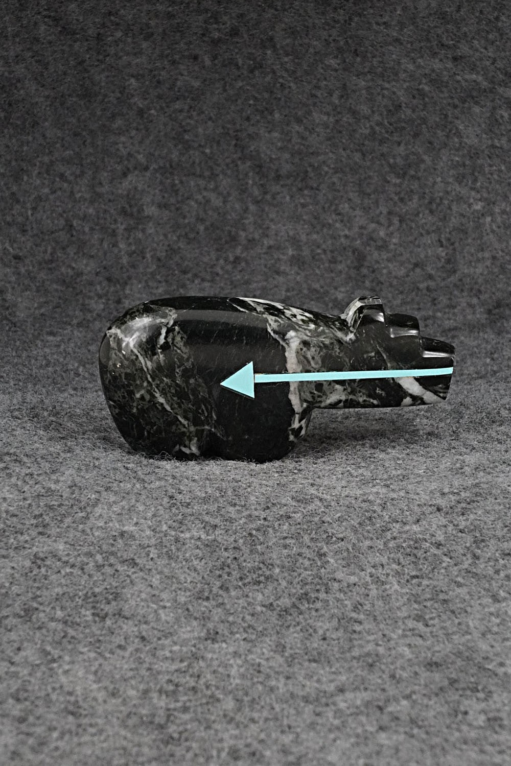 This bear with arrow inlay design Zuni fetish was carved by Bernard Laiwakete. The bottom is signed BL and Zuni.