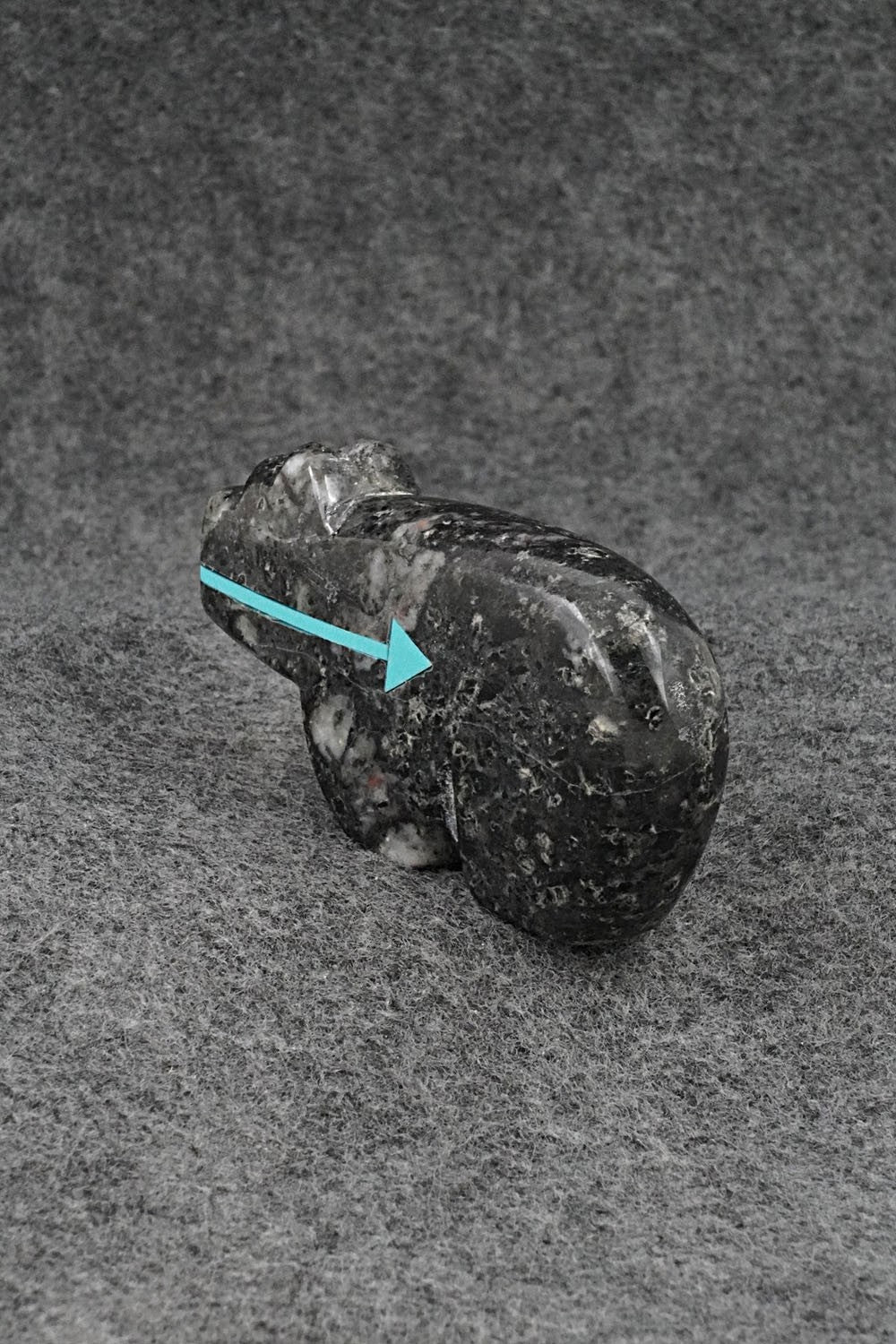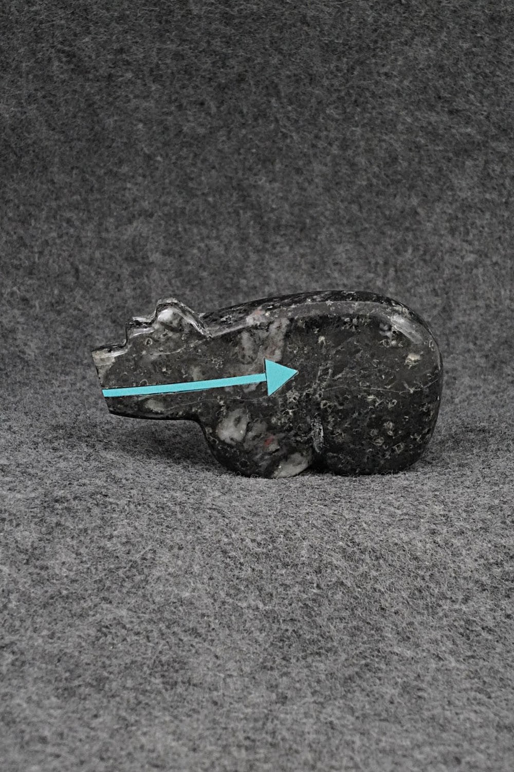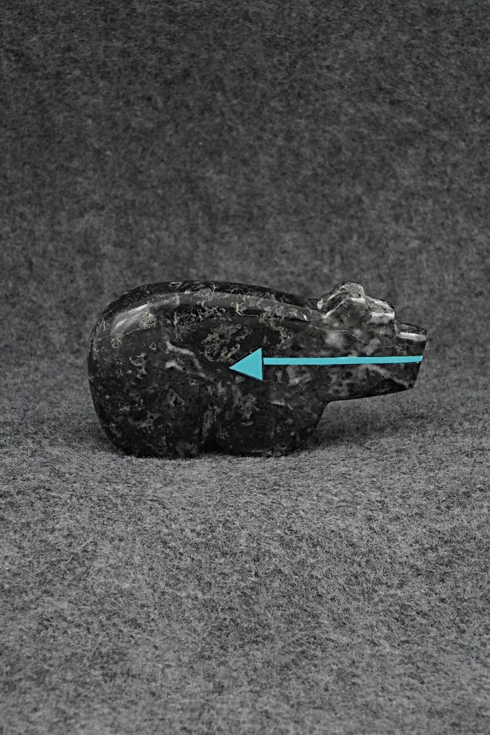This bear with inlay arrow design Zuni fetish was carved by Bernard Laiwakete. The bottom is signed BL and Zuni.