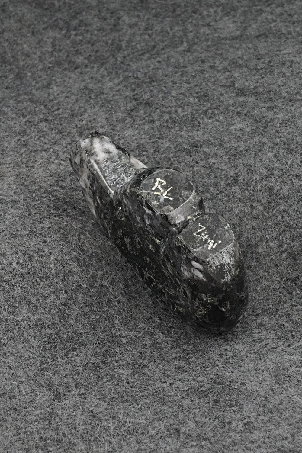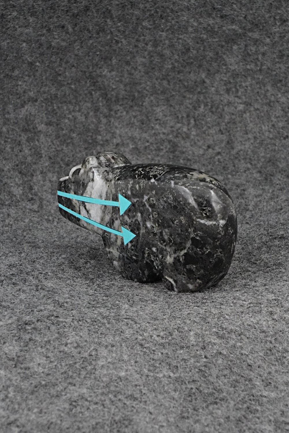 This bear with inlay arrow design Zuni fetish was carved by Bernard Laiwakete. The bottom is signed BL and Zuni.