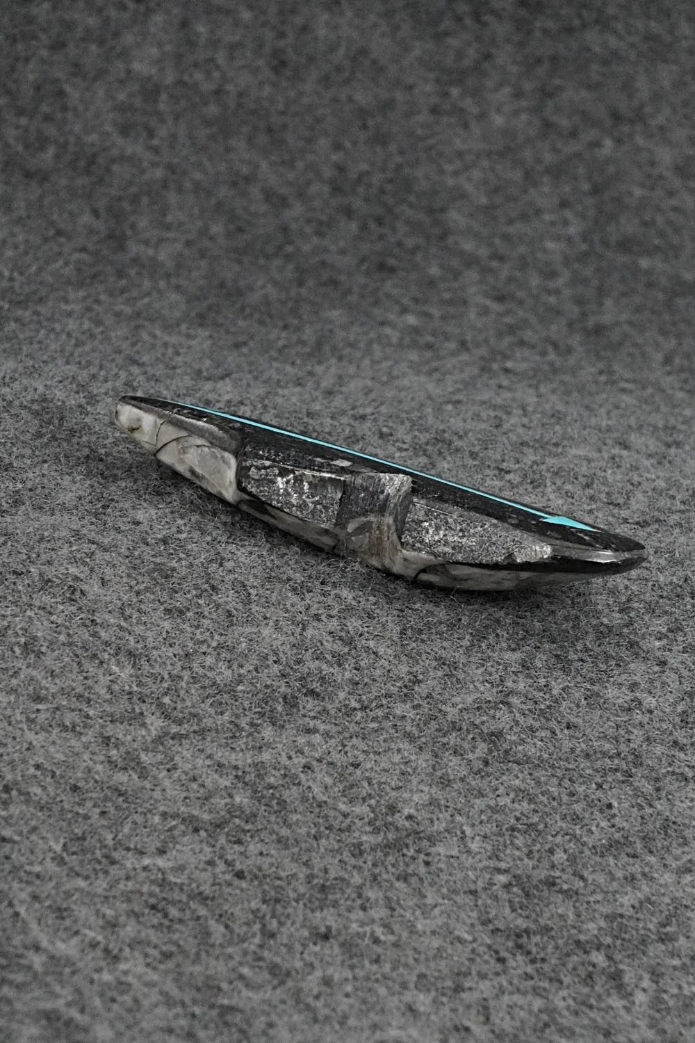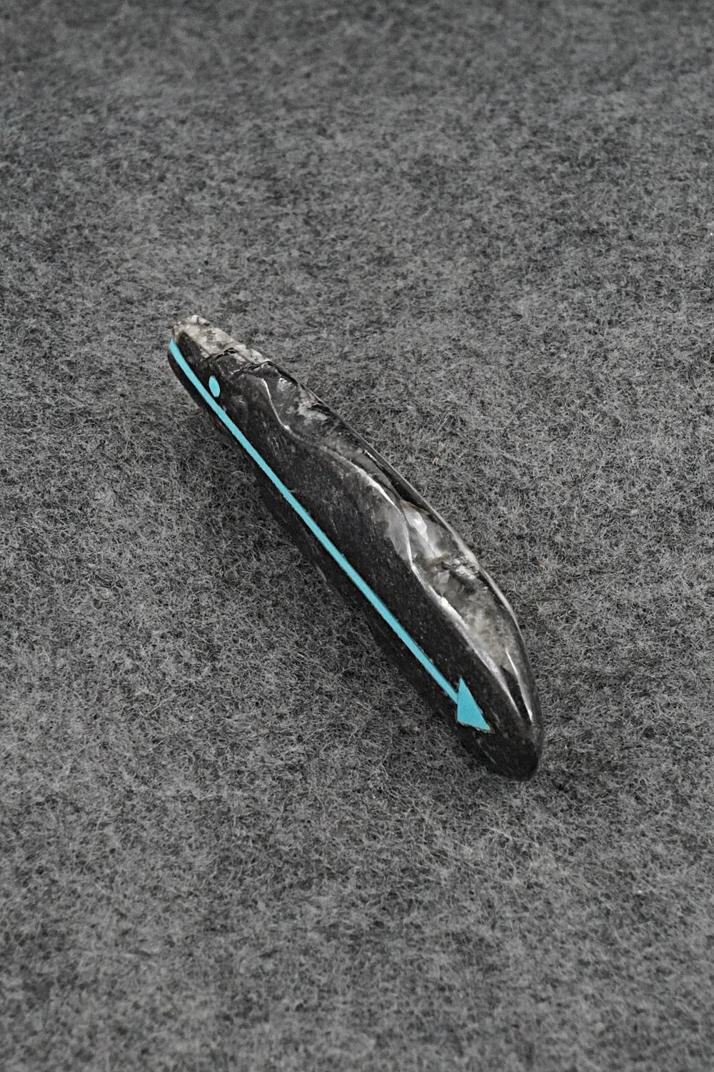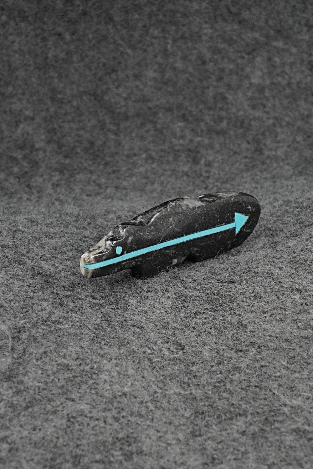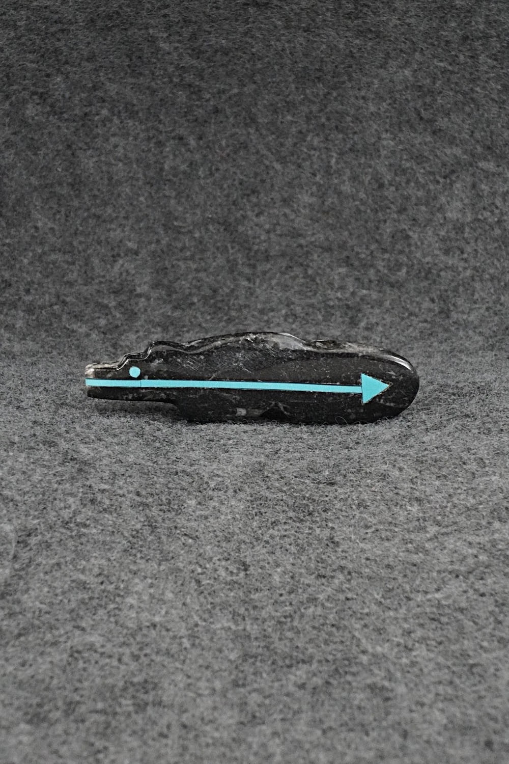 This bear with inlay arrow design Zuni fetish was carved by Bernard Laiwakete. The bottom is signed BL and Zuni.