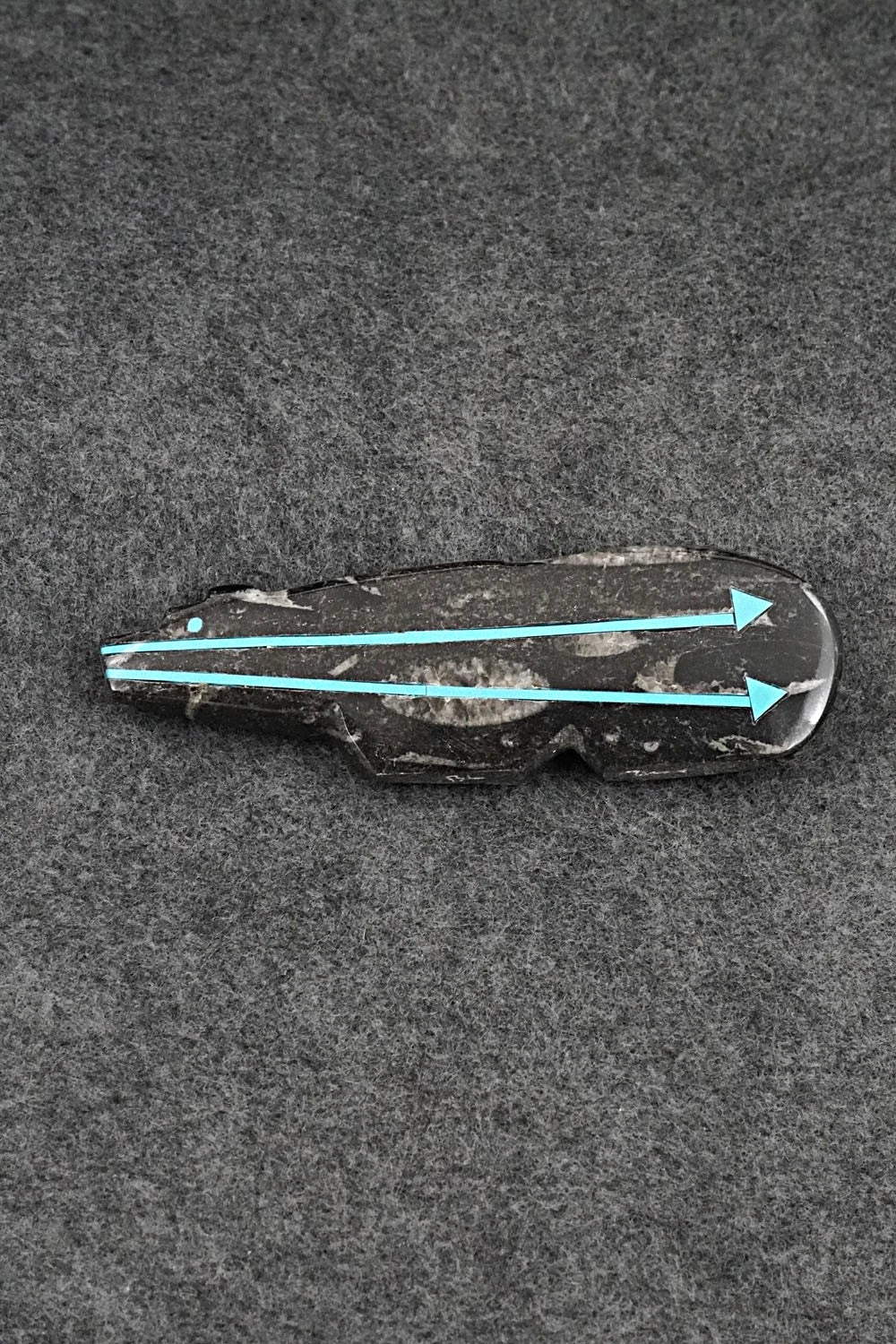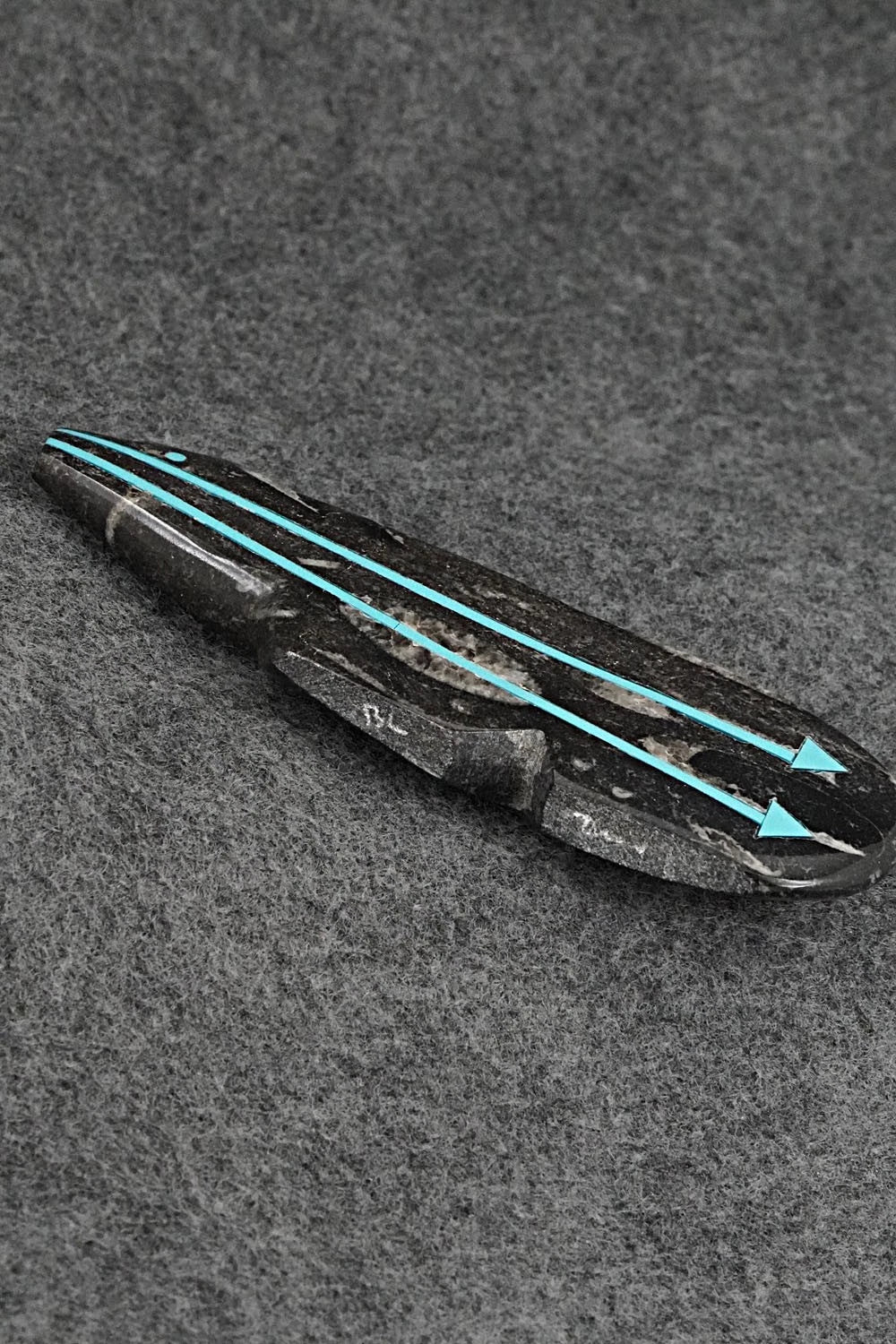 This bear with inlay arrow design Zuni fetish was carved by Bernard Laiwakete. The bottom is signed BL and Zuni.
