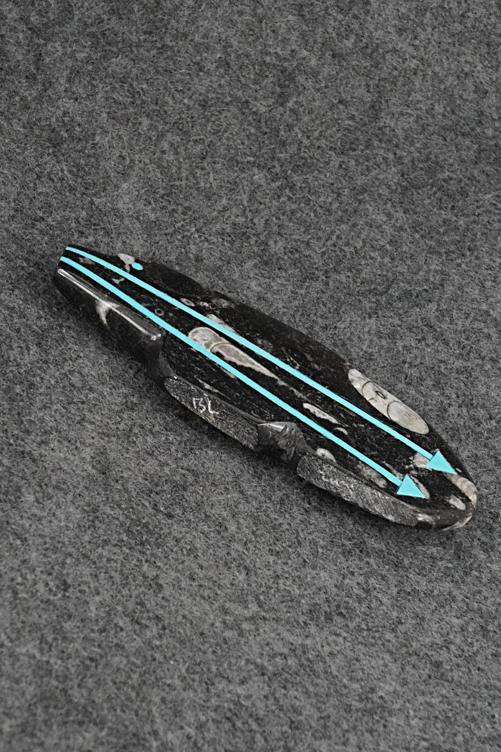 This bear with inlay arrow design Zuni fetish was carved by Bernard Laiwakete. The bottom is signed BL and Zuni.