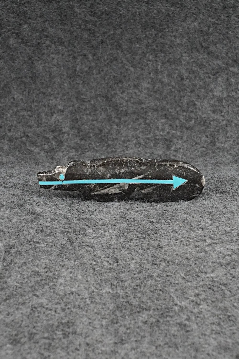 This bear with inlay arrow design Zuni fetish was carved by Bernard Laiwakete. The bottom is signed BL and Zuni.