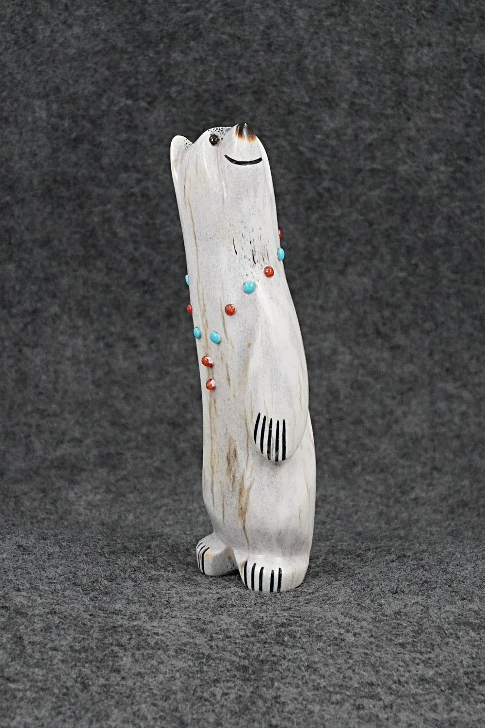 This smiling bear Zuni fetish was carved by Claudia Peina. The bottom is signed CPZ.