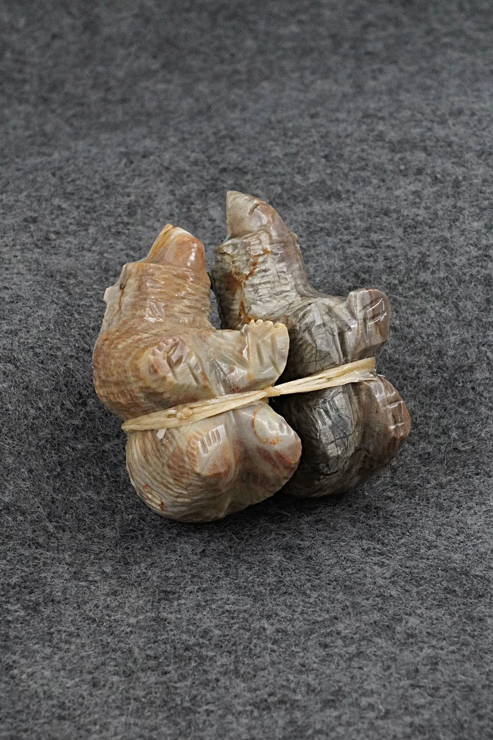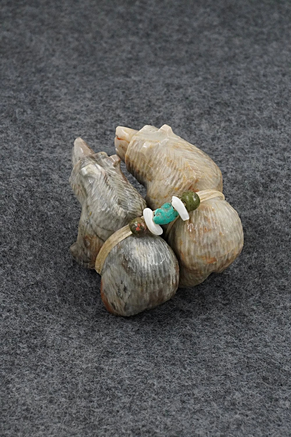 This Zuni fetish featuring two bears with stone offering was carved by Farlan & Paulette Quam. The bottom is signed FPQ.