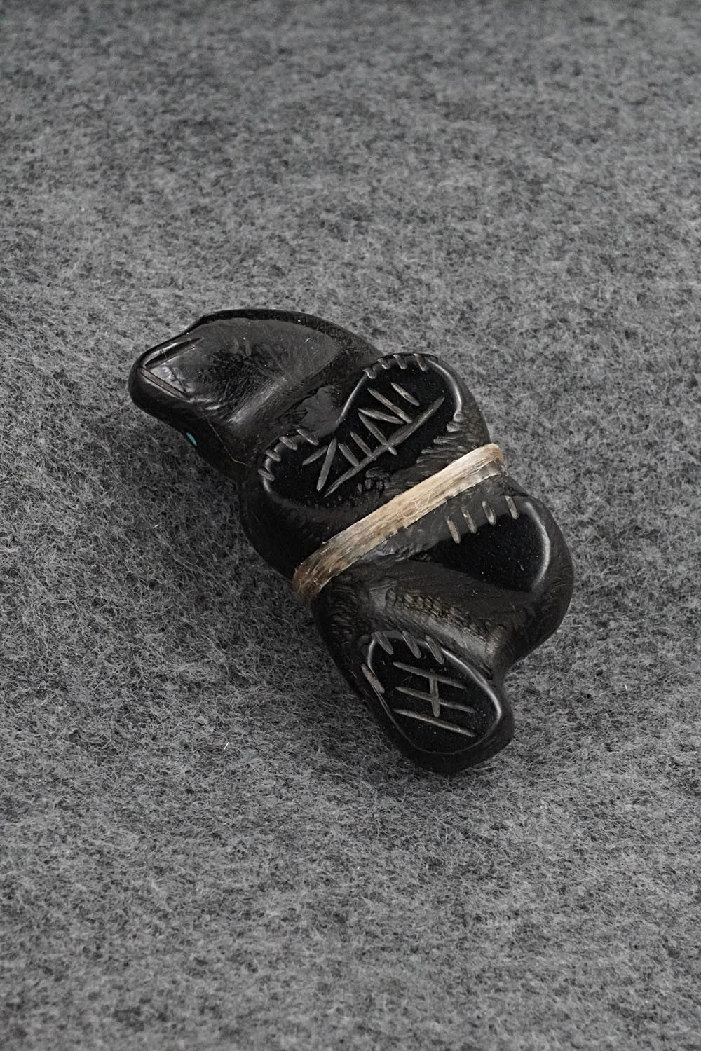 This bear Zuni fetish was carved by Herb Halate. The bottom is signed HH and Zuni.