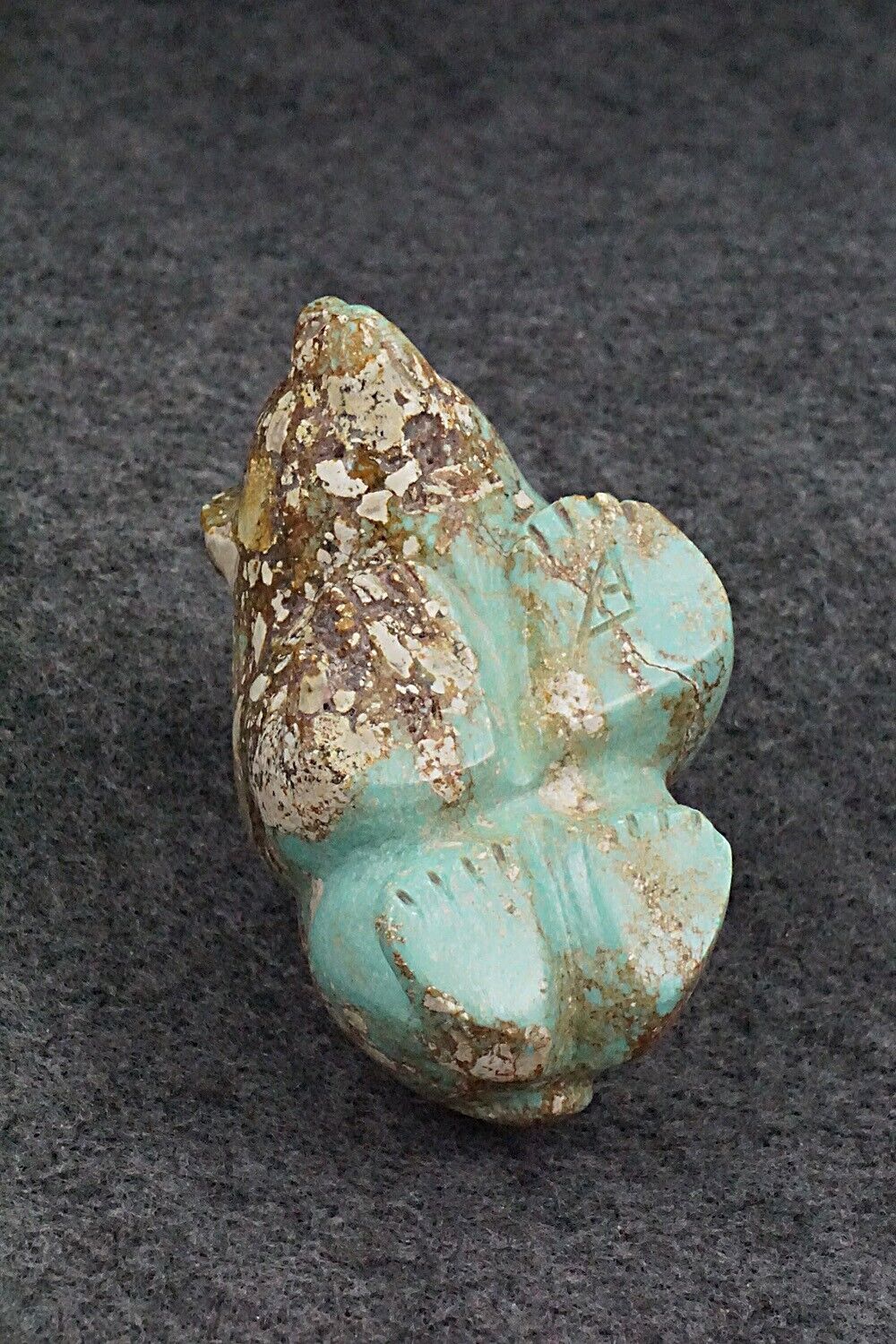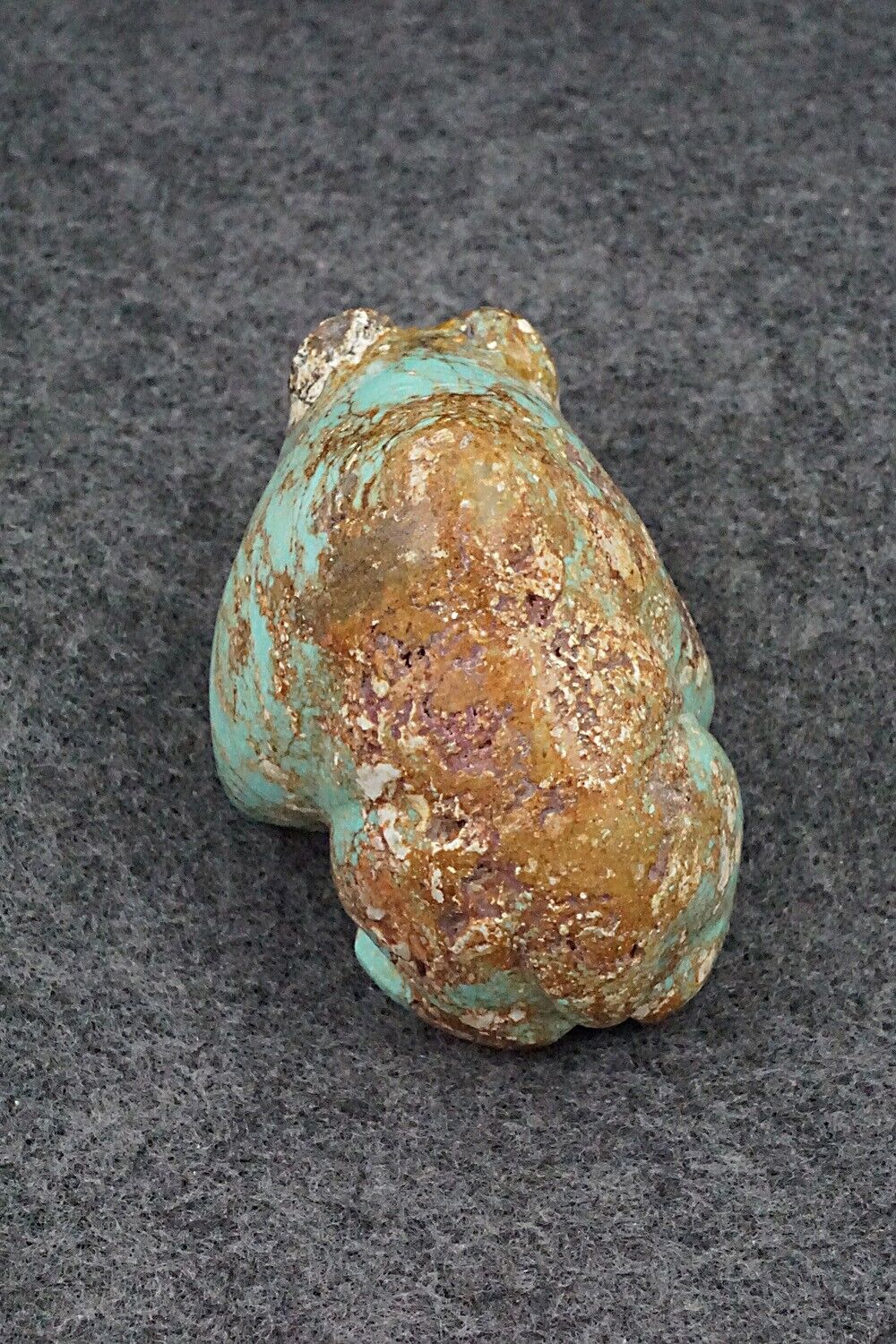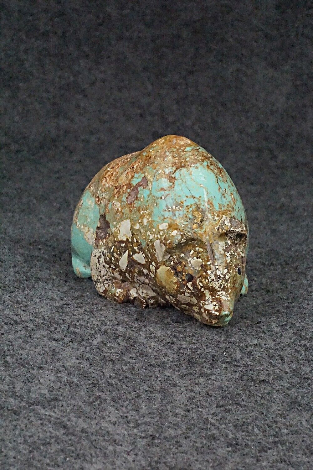 This beautiful bear fetish was carved from stabilized turquoise by Navajo artisan Roy Davis. The bottom is signed.