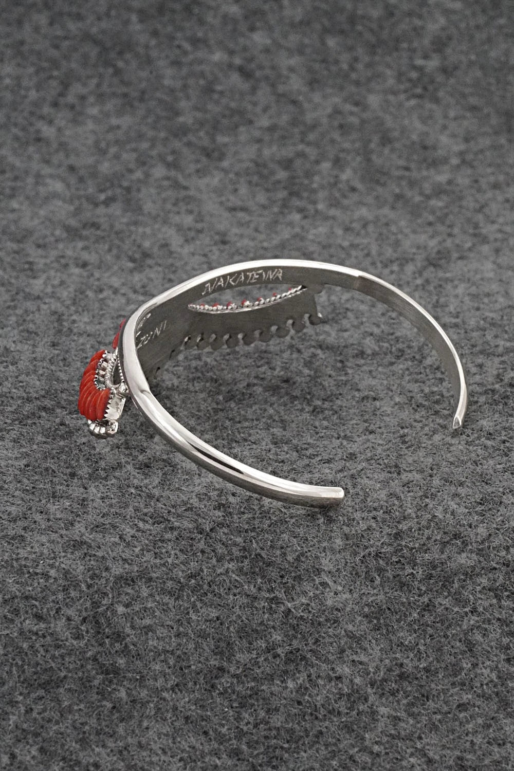 This amazing "needlepoint" cut coral and sterling silver bracelet was made by Zuni silversmith Stewart Nakatewa. The back is signed Stewart Nakatewa and Zuni.