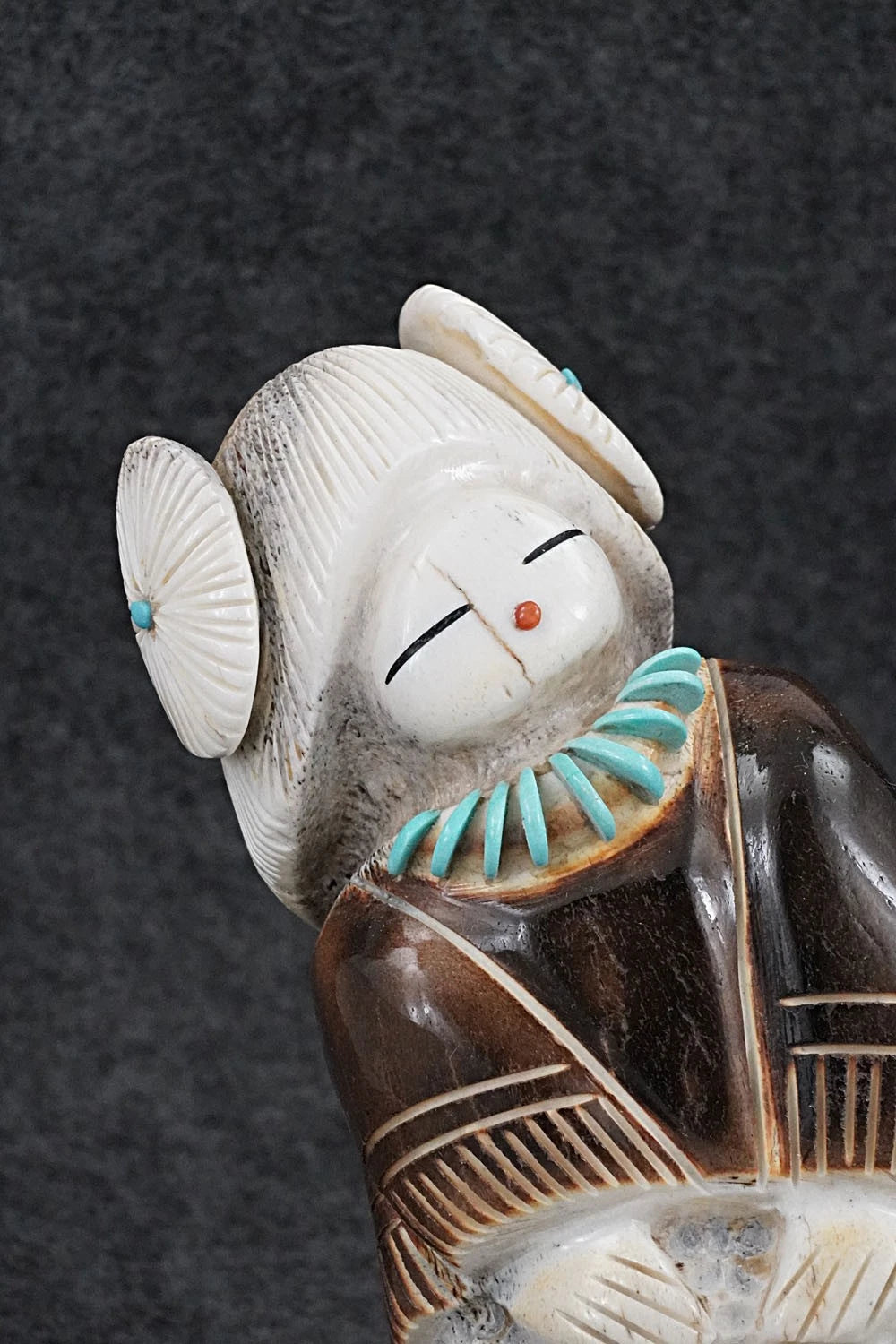 This corn maiden Zuni fetish was carved by Claudia Peina. The bottom is signed CPZ.