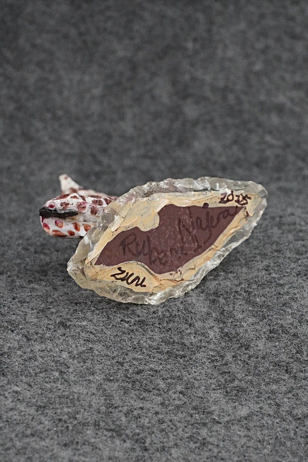 This giraffe Zuni fetish was carved by Ruben Najara. The bottom is signed Ruben Najara, Zuni 2025.