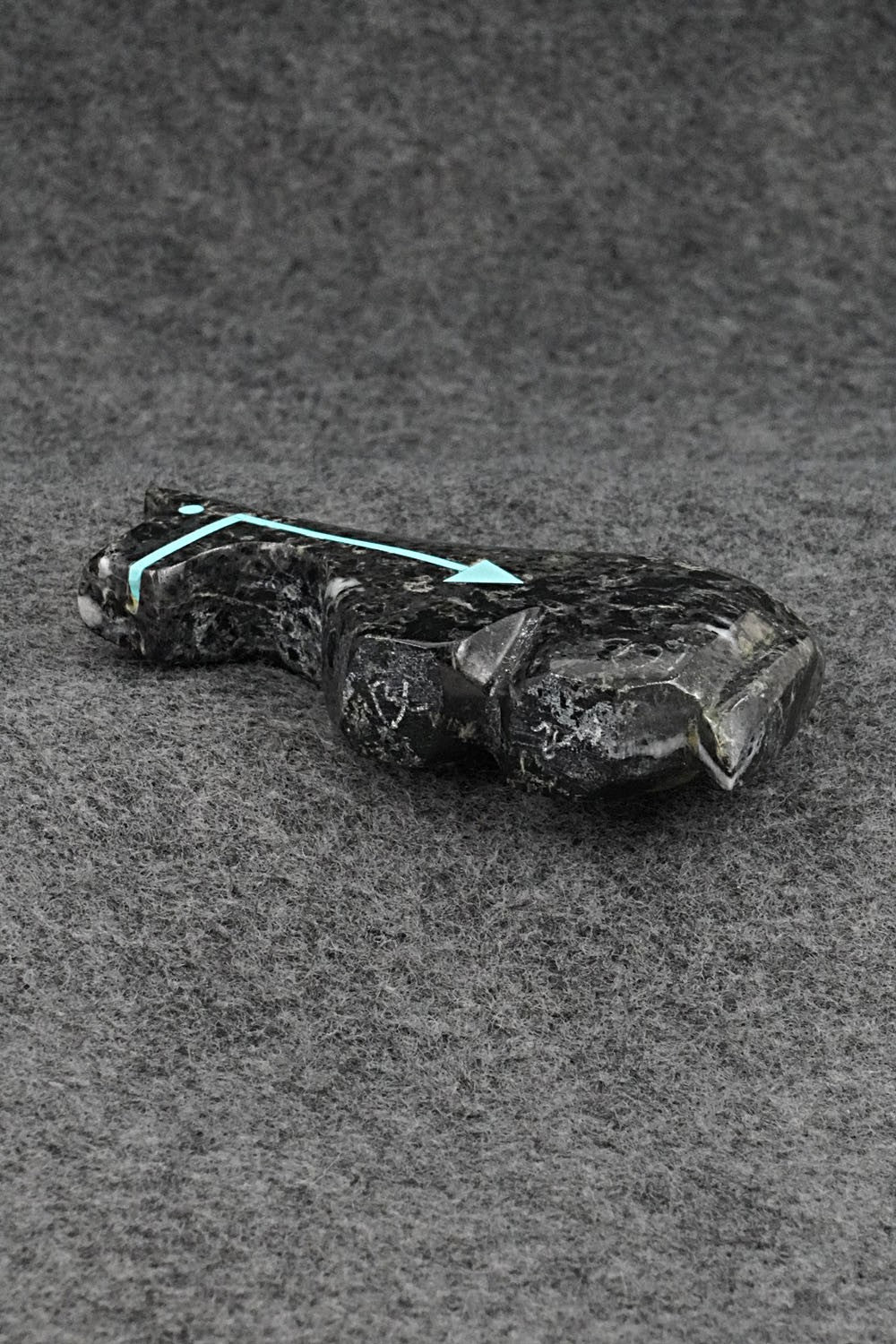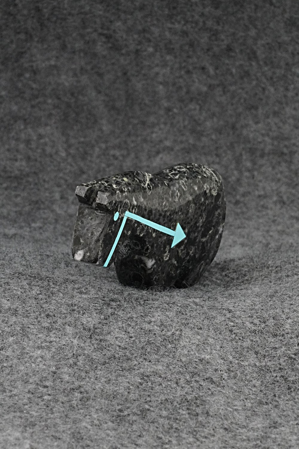This horse with arrow inlay design Zuni fetish was carved by Bernard Laiwakete. The bottom is signed BL and Zuni.