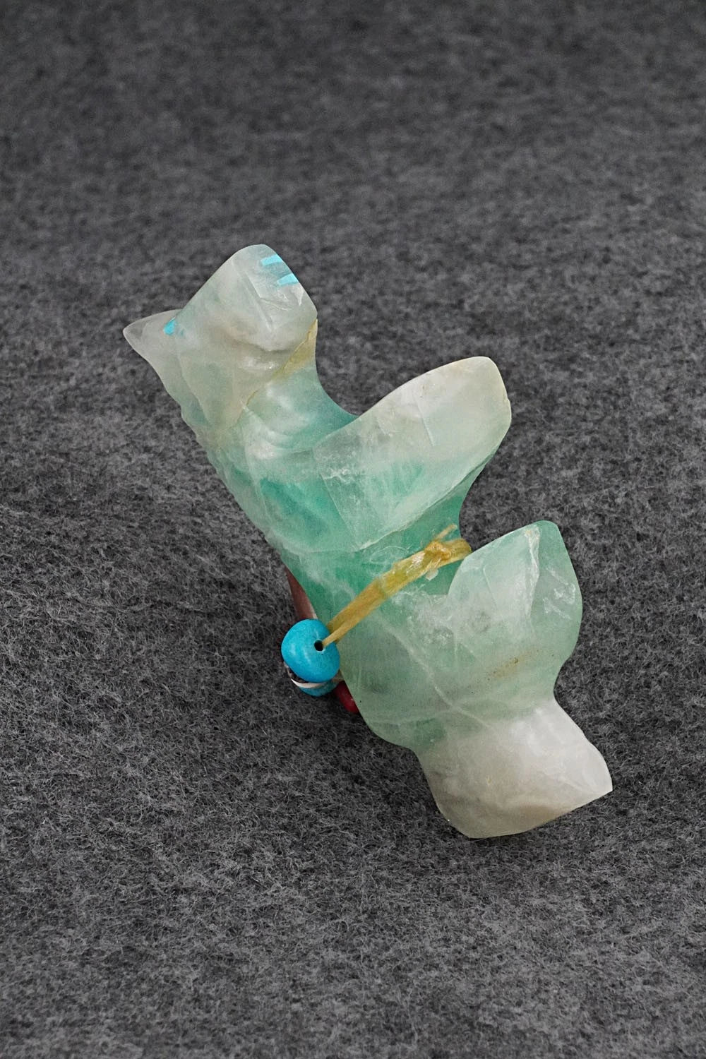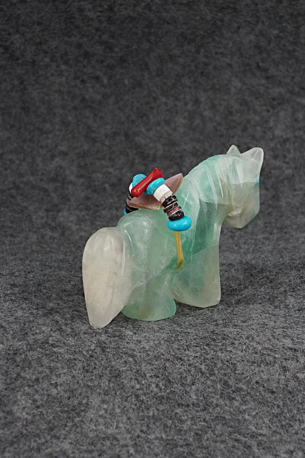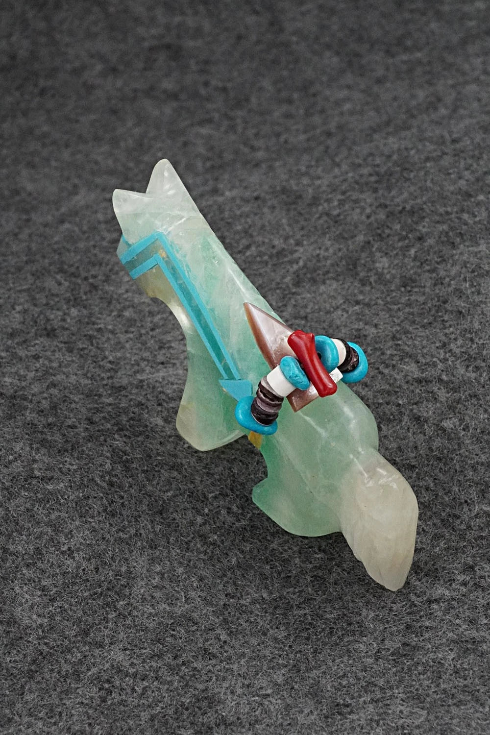 This horse Zuni fetish with arrowhead offering was carved by Rodney Laiwakete. The bottom is signed.