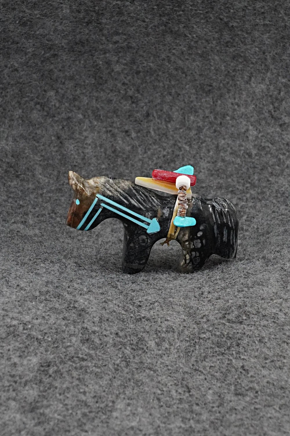 This horse with arrow inlay design and arrowhead offering Zuni fetish was carved by Rodney Laiwakete. The bottom is signed.