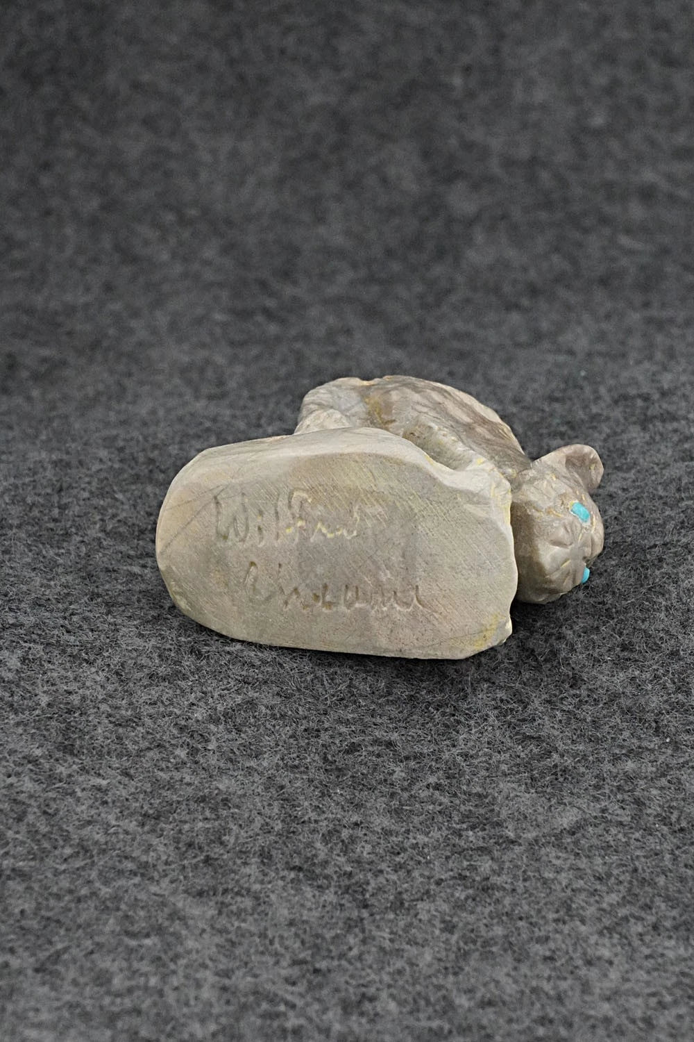 This mountain lion Zuni fetish was carved by Wilfred Cheama. The bottom is signed Wilfred Cheama.
