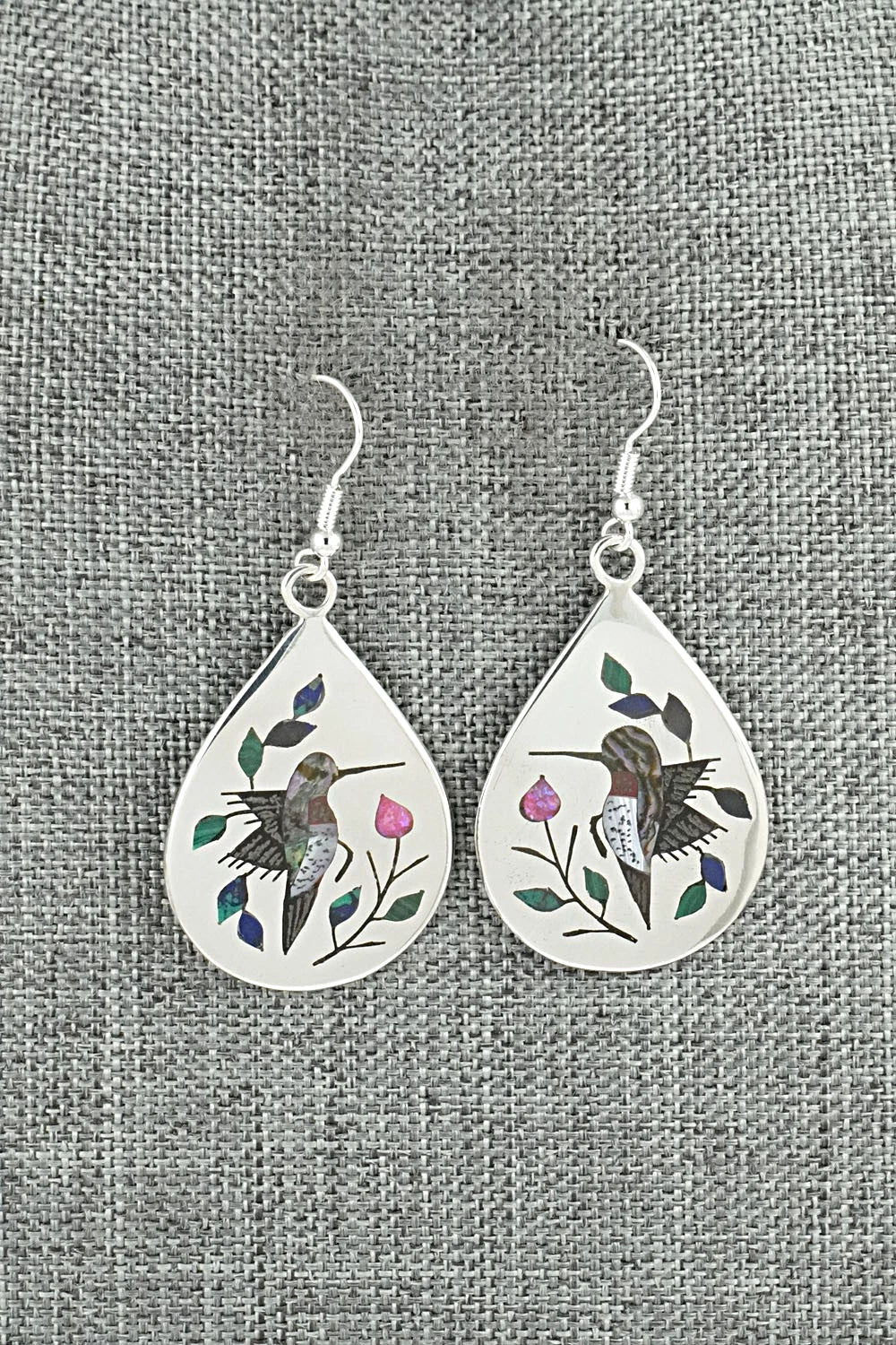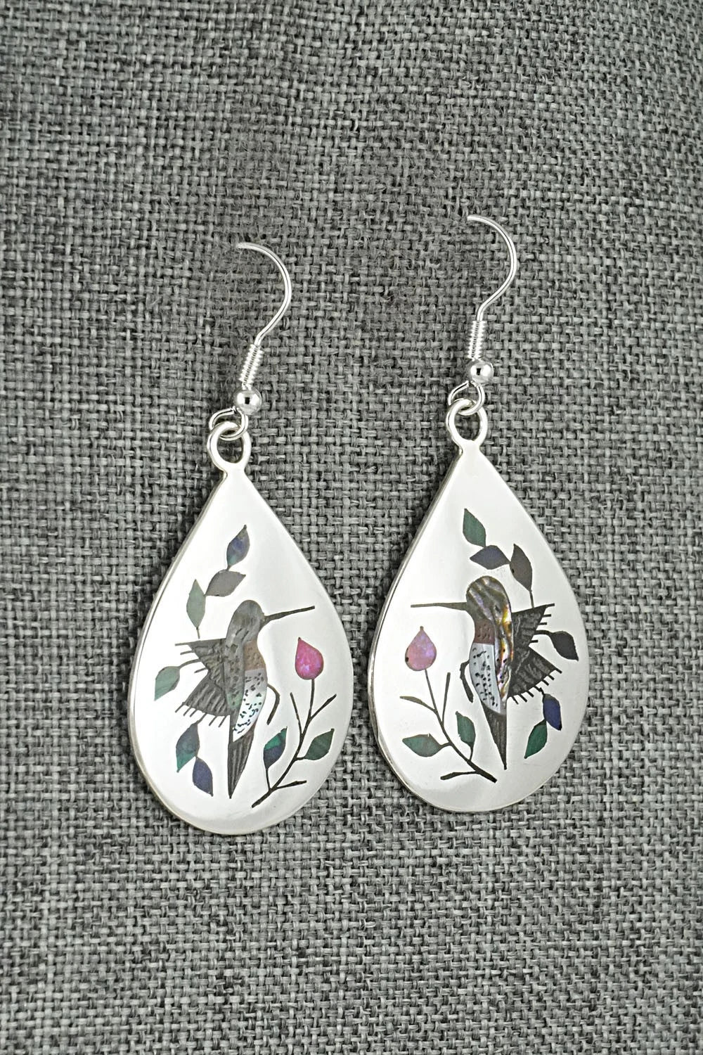 These beautiful turquoise, coral, abalone, Opalite, malachite, lapis and bright-polish sterling silver inlay earrings featuring a hummingbird design were made by Zuni silversmith Raymond Boyd. The backs are signed and stamped sterling.