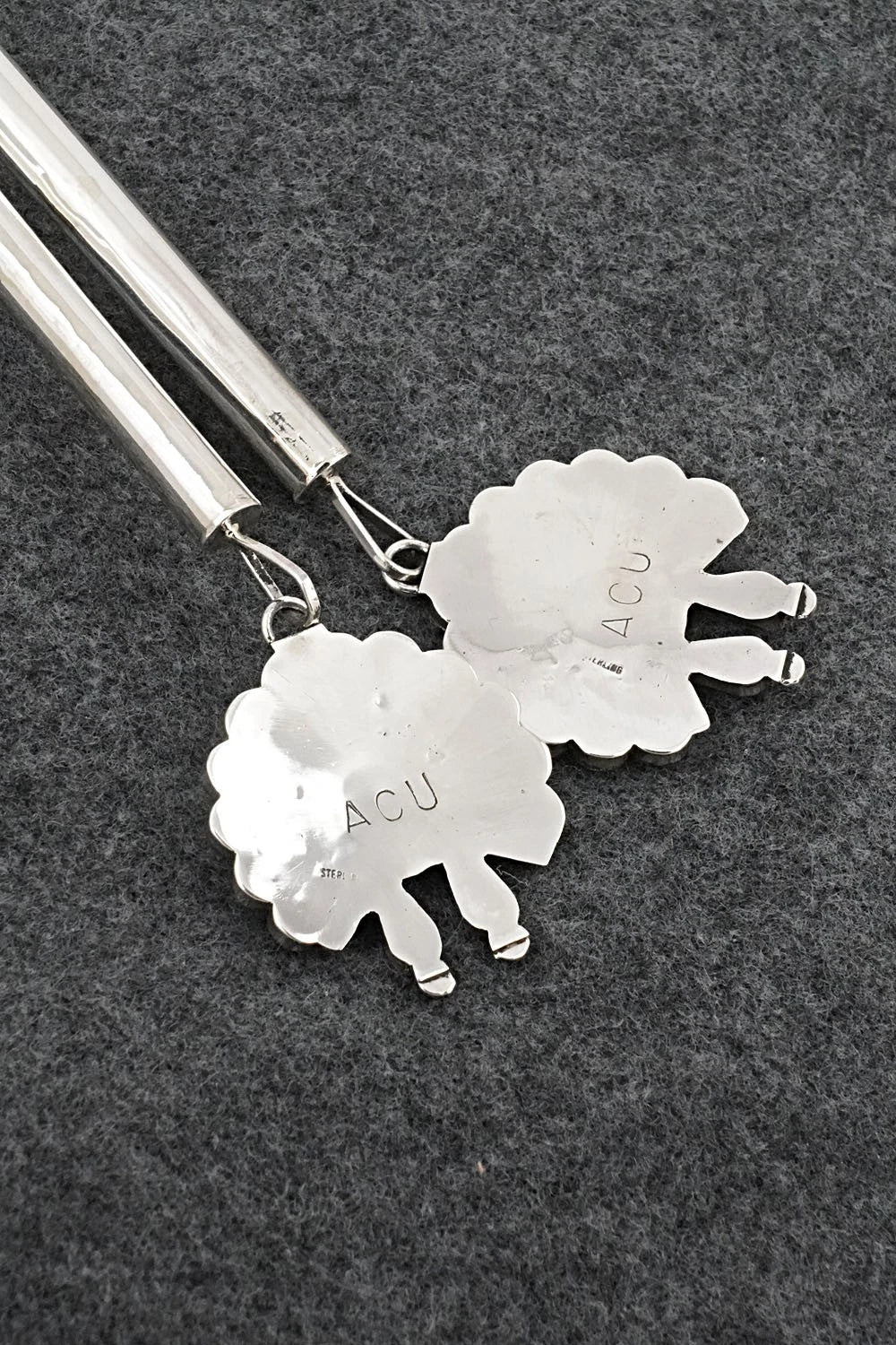 This stunning mother of pearl, onyx, coral, turquoise and sterling silver inlay Sun Face bolo tie was made by Zuni silversmith April Unkestine. The back is stamped ACU.