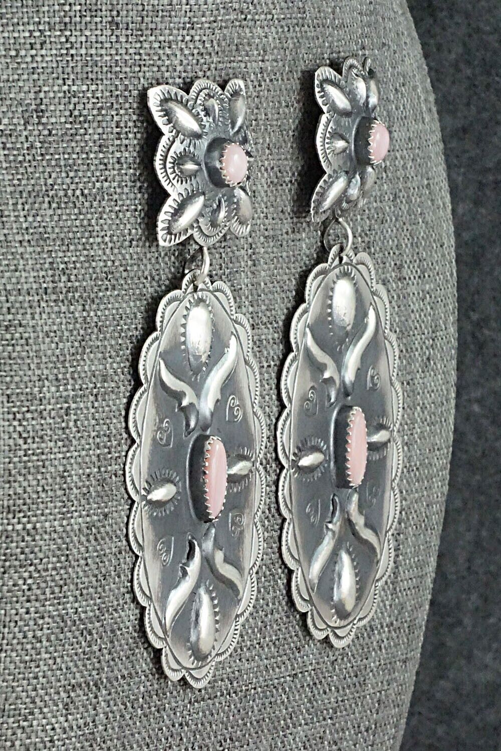 These pink conch shell and sterling silver earrings were made by Navajo silversmith Glenn Livingston. The backs are signed and stamped sterling.