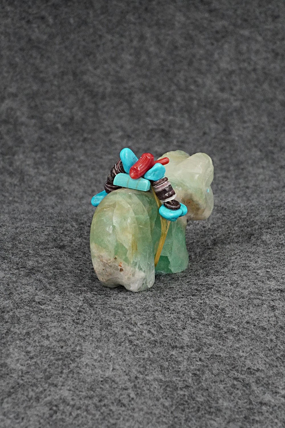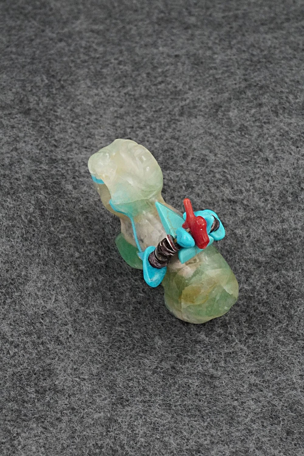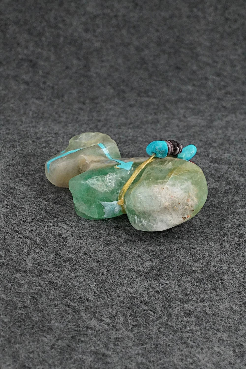 This ram Zuni fetish with arrowhead offering was carved by Rodney Laiwakete. The bottom is signed.