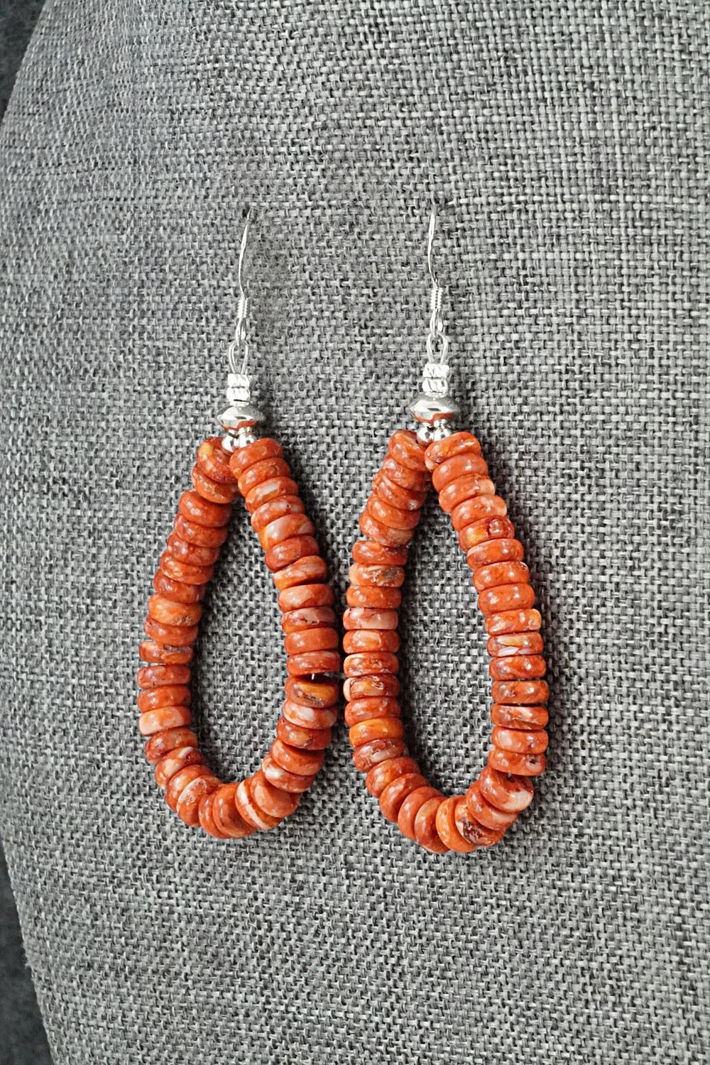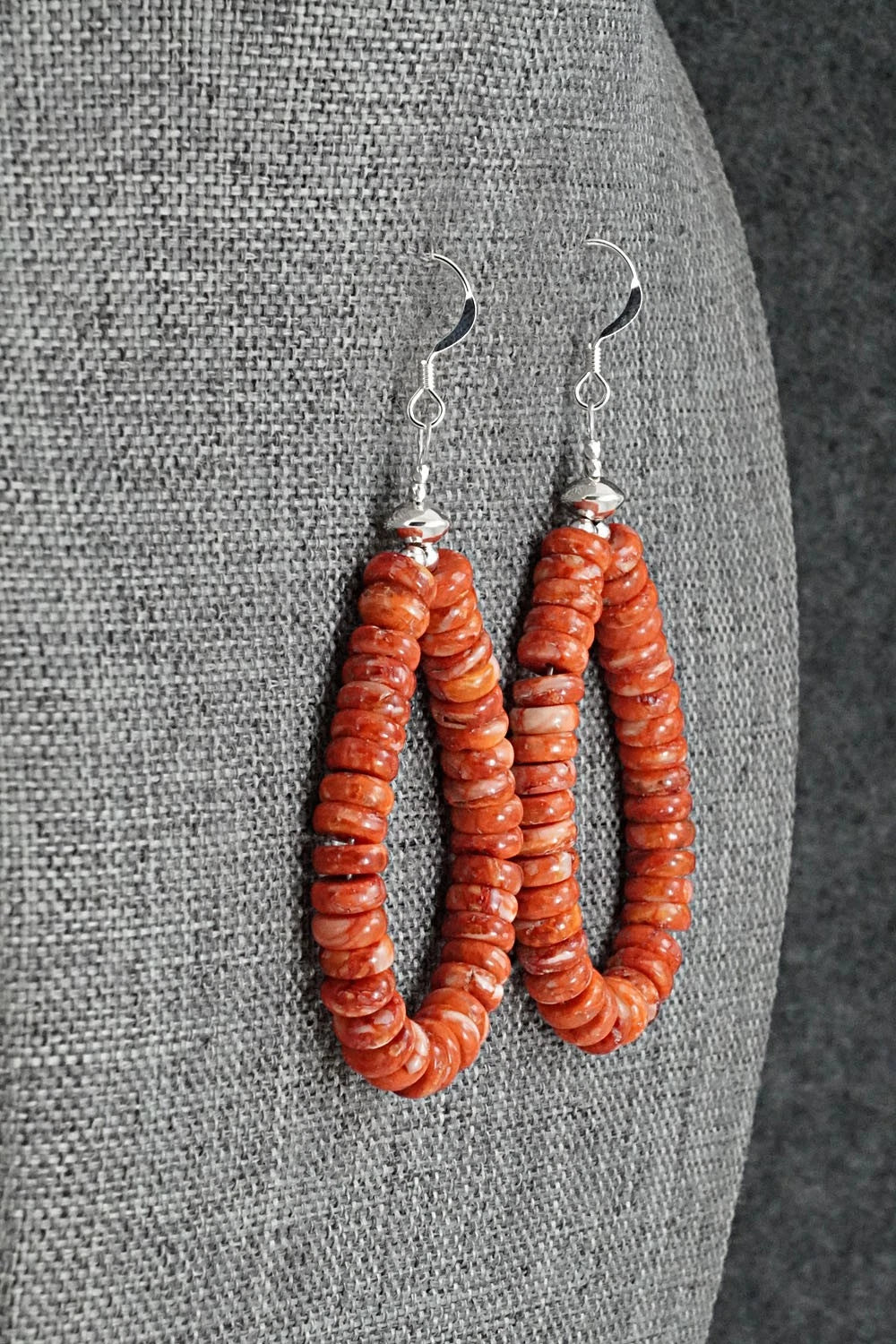 These beaded spiny oyster and sterling silver earrings were made by Navajo silversmith Louise Joe.