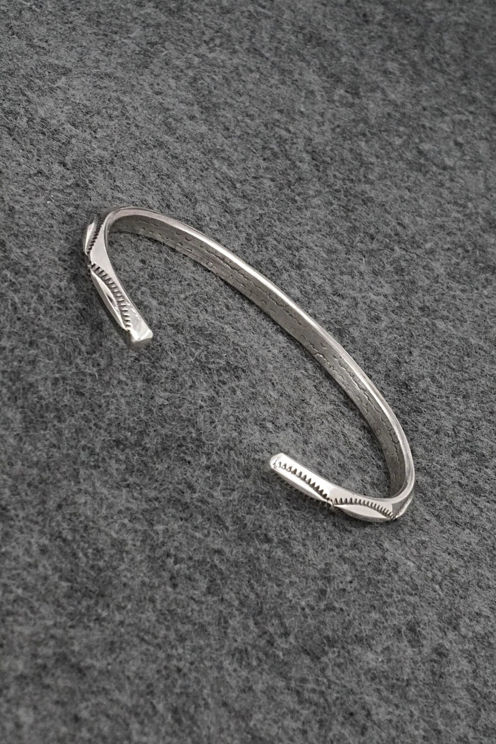 This bright-polish sterling silver bracelet was made by Navajo silversmith Elaine Tahe. The inside of the cuff is stamped sterling.