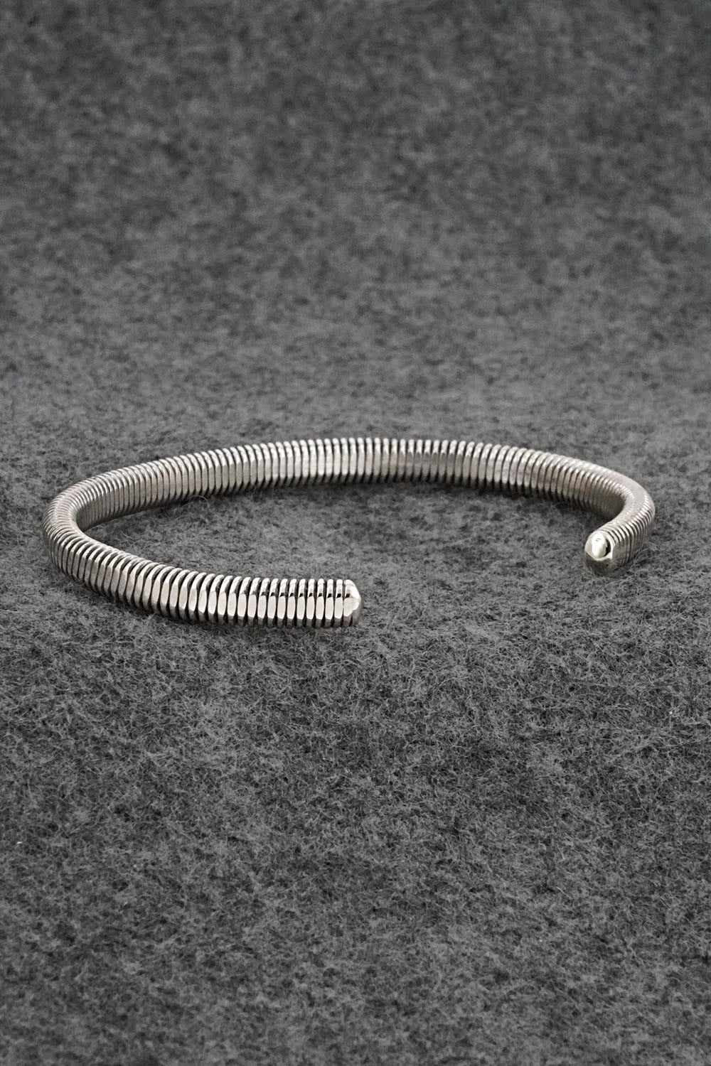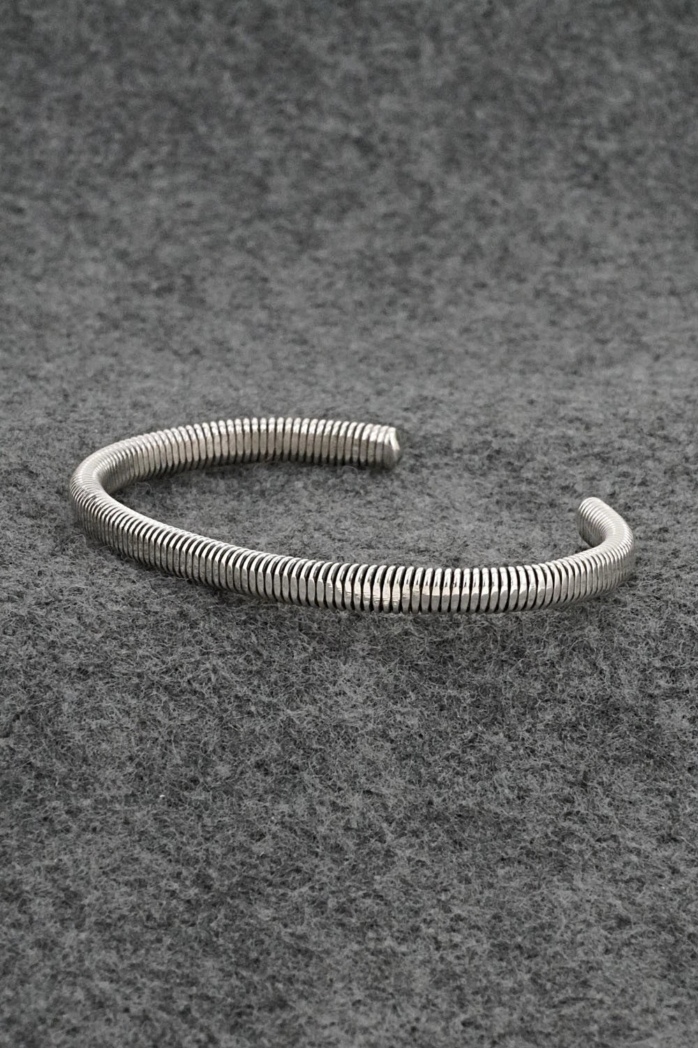 This bright-polish sterling silver bracelet was made by Navajo silversmith Elaine Tahe.