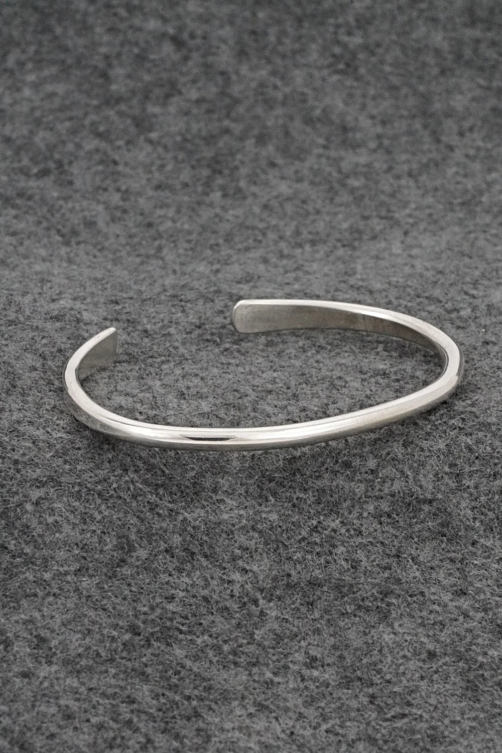 This bright-polish sterling silver bracelet was made by Navajo silversmith Elaine Tahe. The inside of the cuff is stamped sterling.