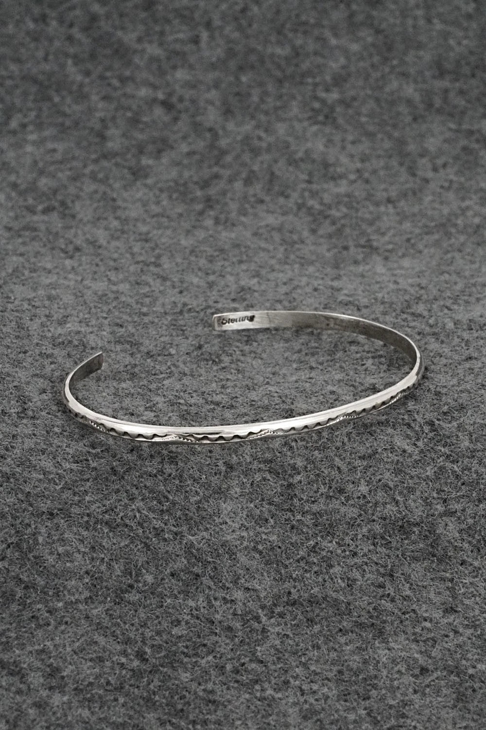 This bright-polish sterling silver bracelet was made by Navajo silversmith Elaine Tahe. The inside of the cuff is stamped sterling.