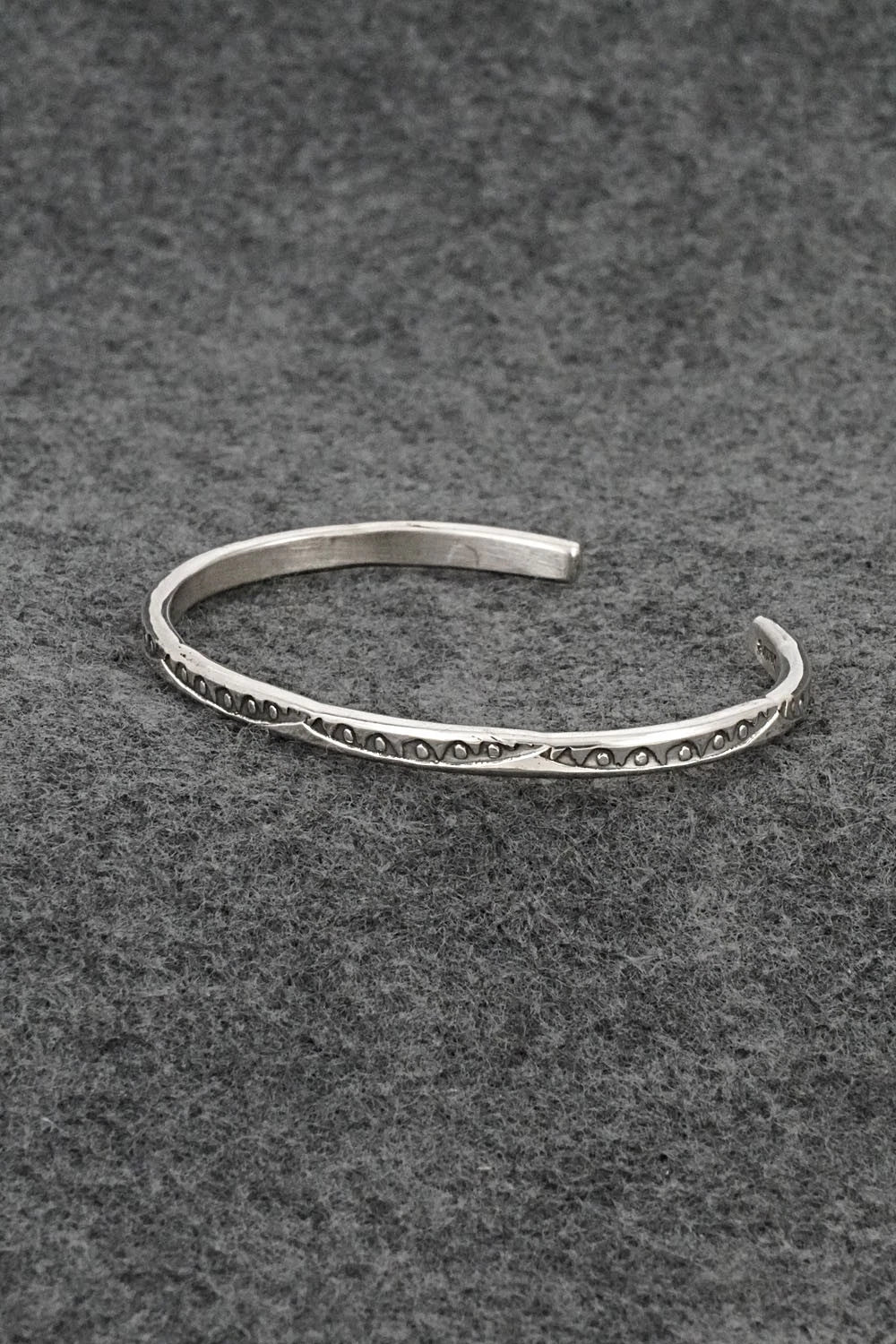 This bright-polish sterling silver bracelet was made by Navajo silversmith Elaine Tahe.