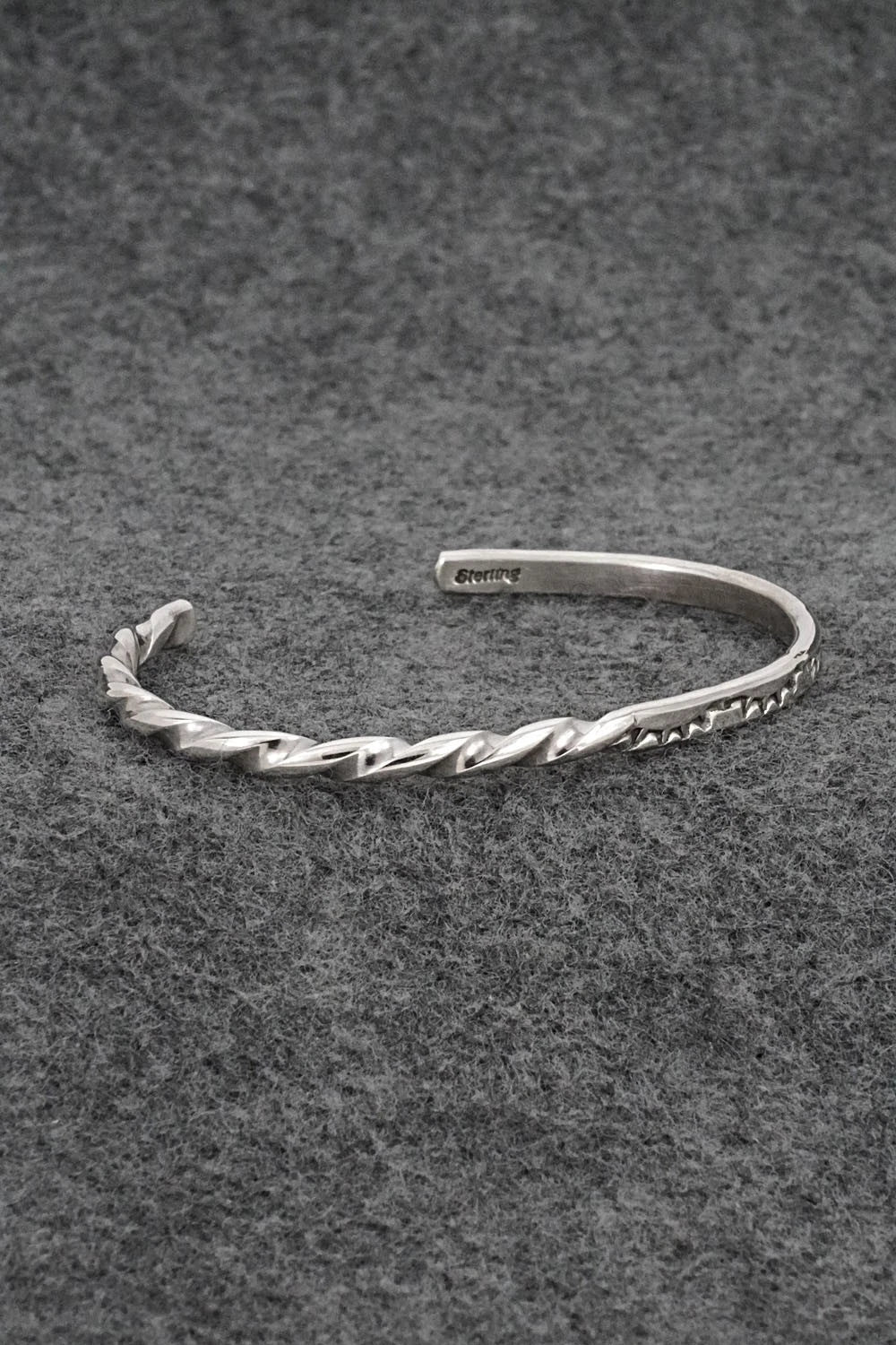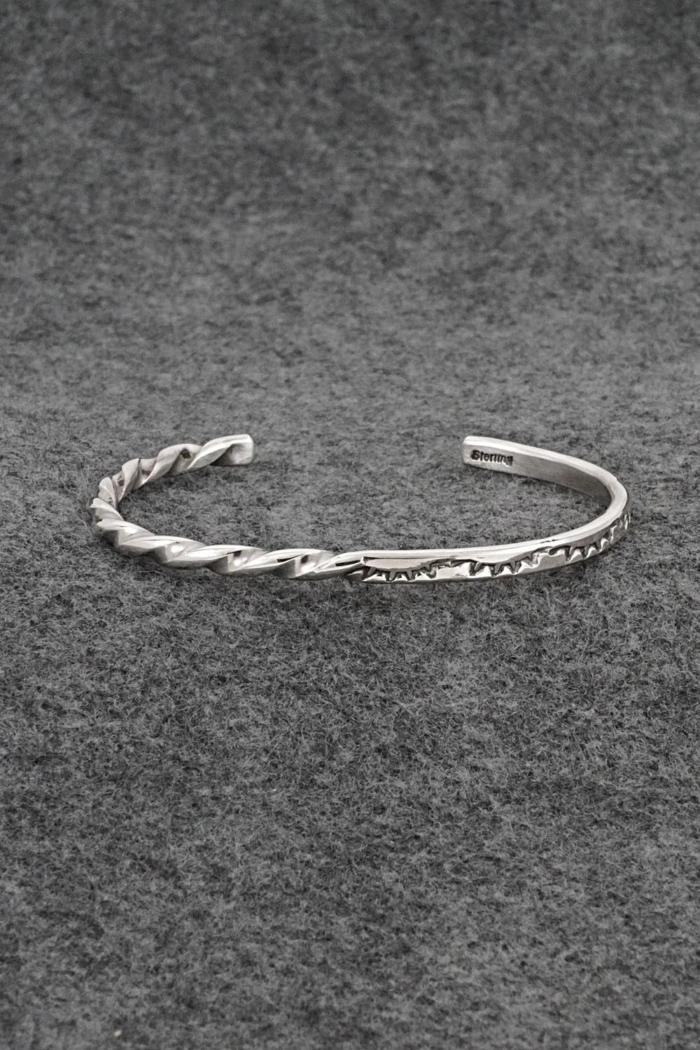 This bright-polish sterling silver bracelet was made by Navajo silversmith Elaine Tahe. The inside of the cuff is stamped sterling.