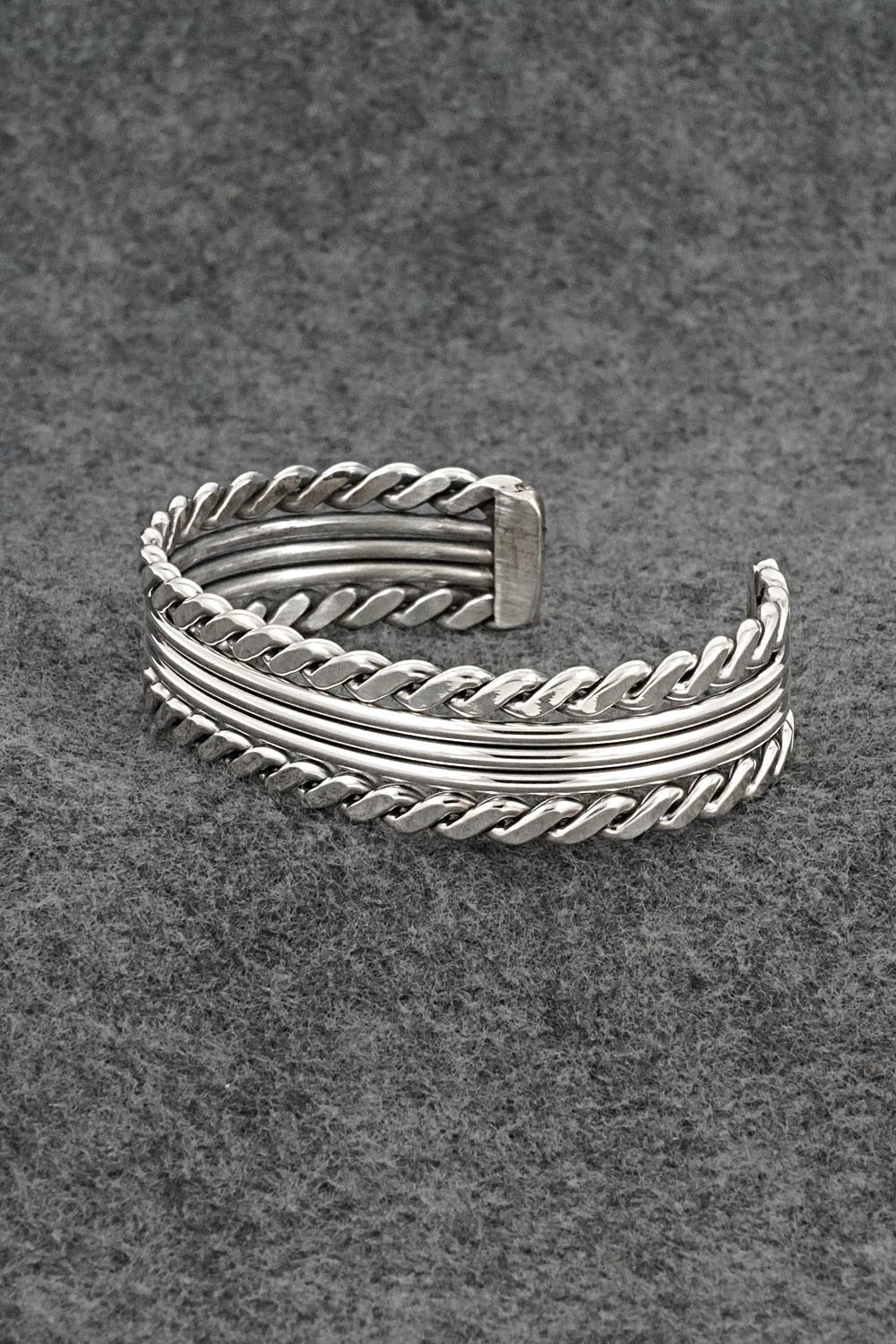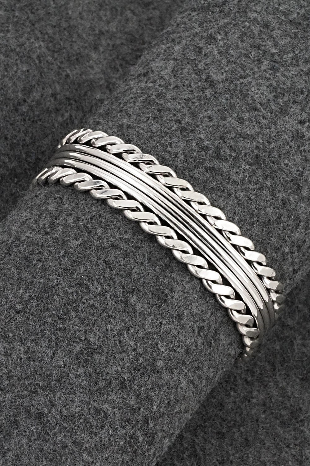 This bright-polish sterling silver bracelet was made by Navajo silversmith Elaine Tahe. The inside of the cuff is stamped Tahe and sterling.
