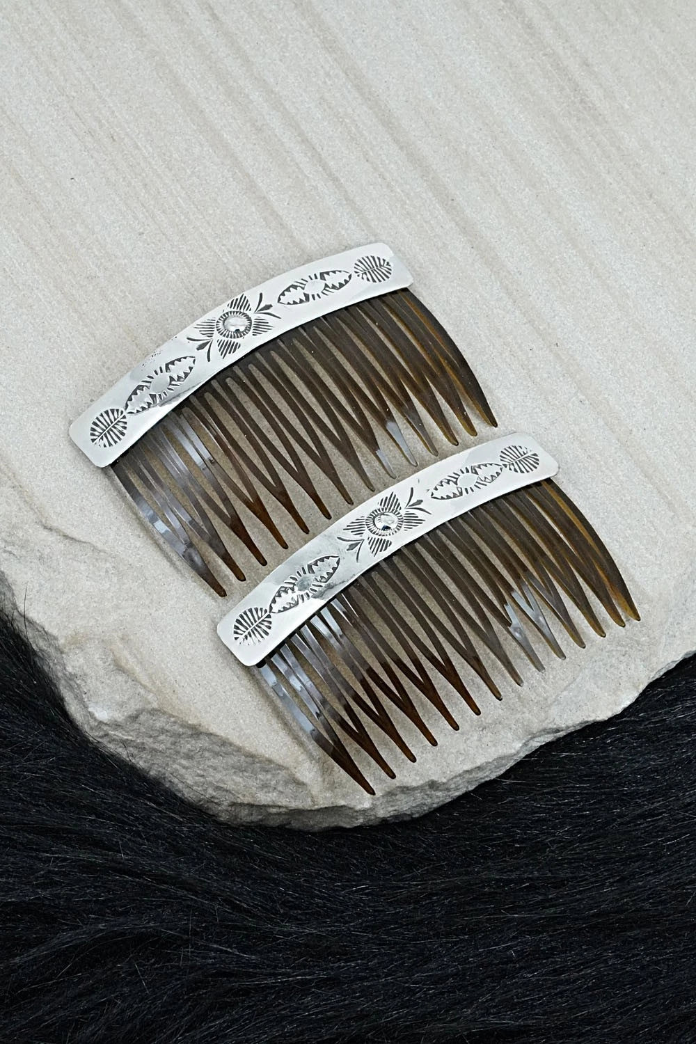 These bright-polish sterling silver hair combs were made by Navajo silversmith Bertha Begay.