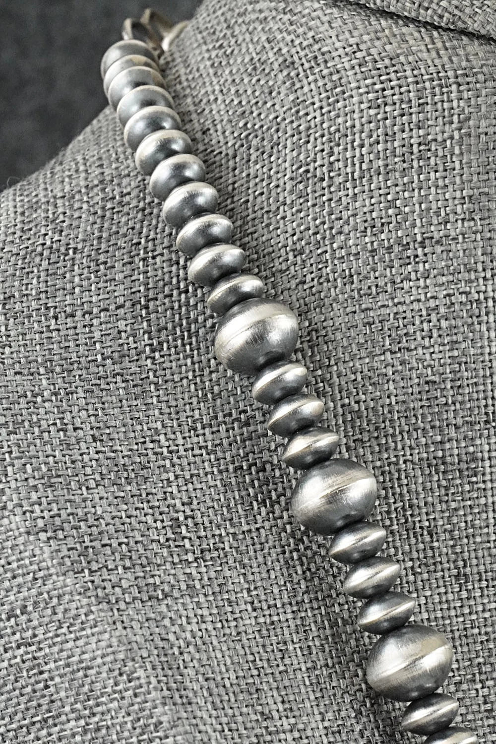 This stunning brushed-finish sterling silver Navajo Pearl necklace was made by Navajo silversmith Crystal Haley. Signed CH and stamped sterling.
