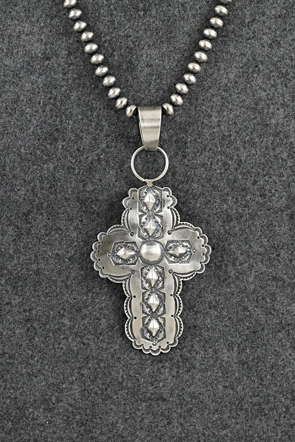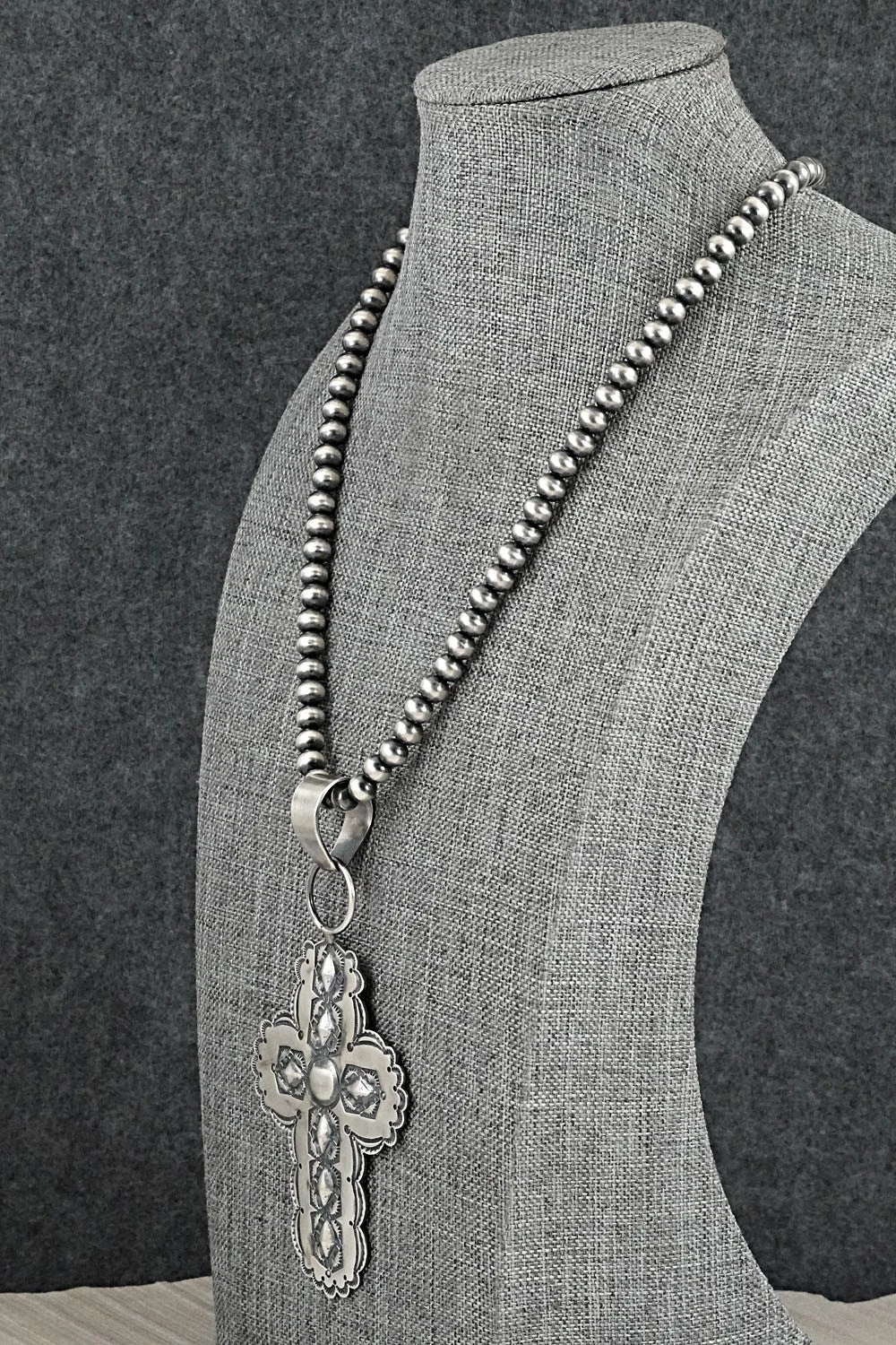 This impressive brushed-finish sterling silver necklace was made by Navajo silversmith Roland Dixson. The back of the bail is signed and stamped sterling.