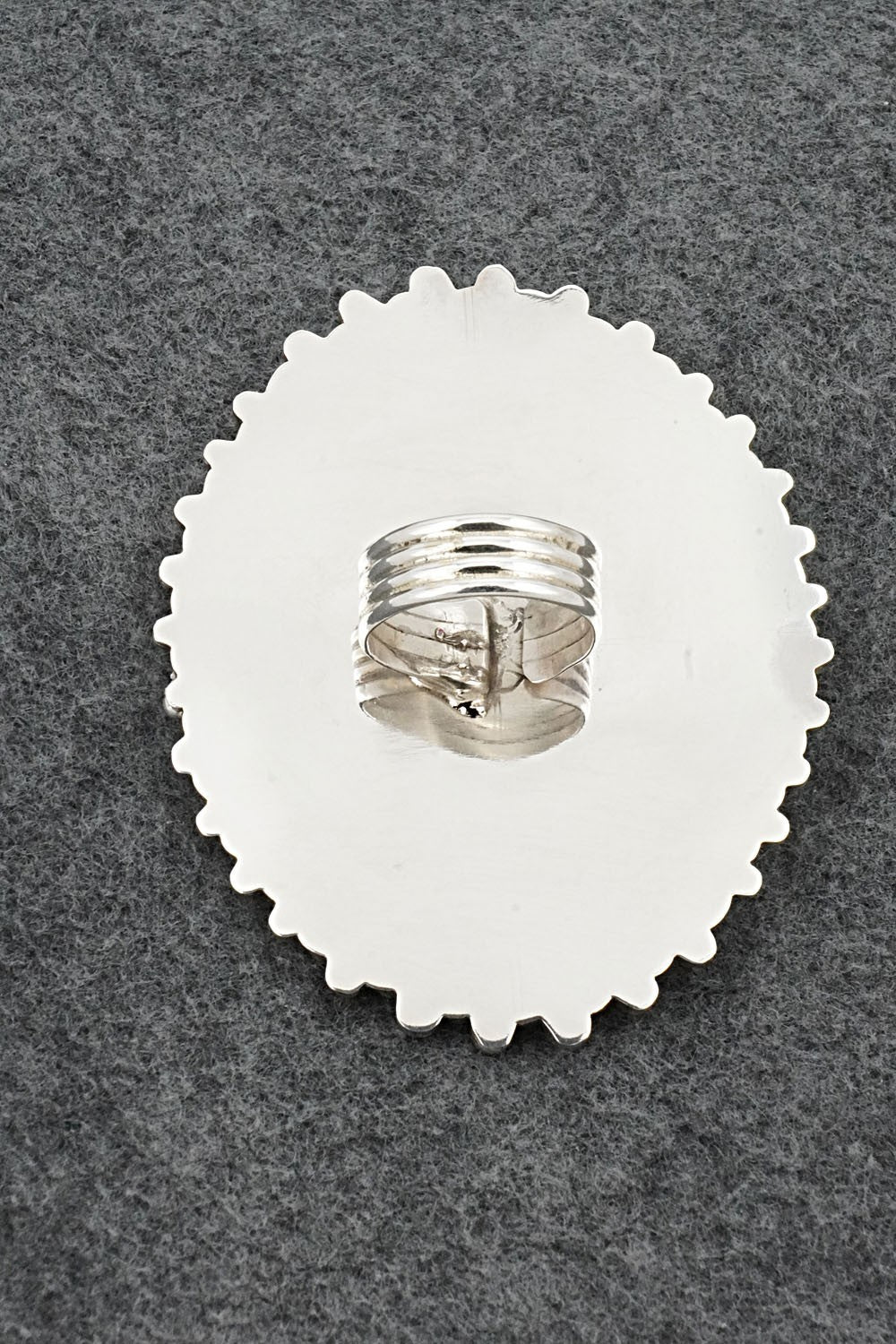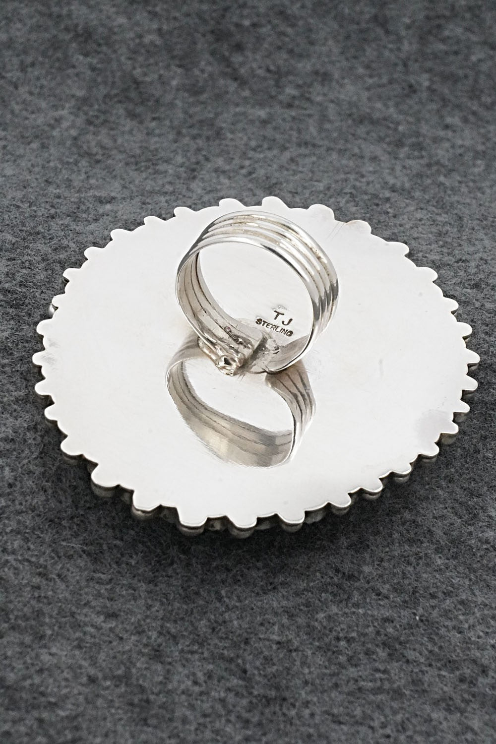 This stunning coral, turquoise and sterling silver ring was made by Navajo silversmith Tina Jones. The back is stamped TJ and sterling.