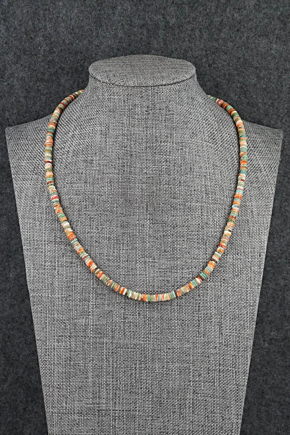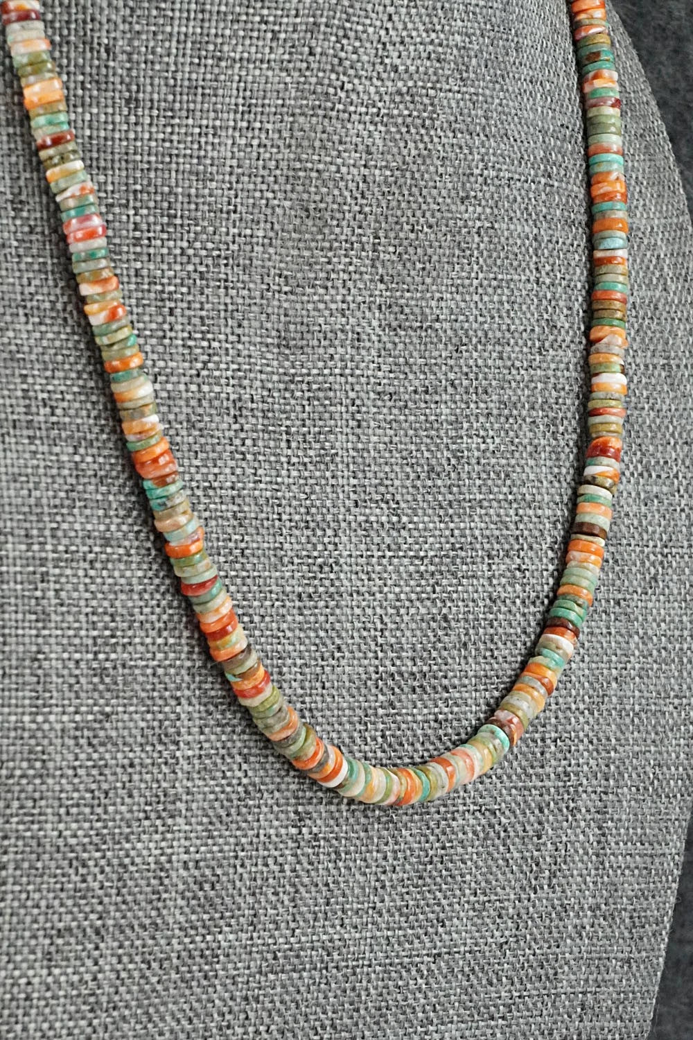 This beaded turquoise, spiny oyster and sterling silver necklace was made by Navajo artisan Doreen Jake.