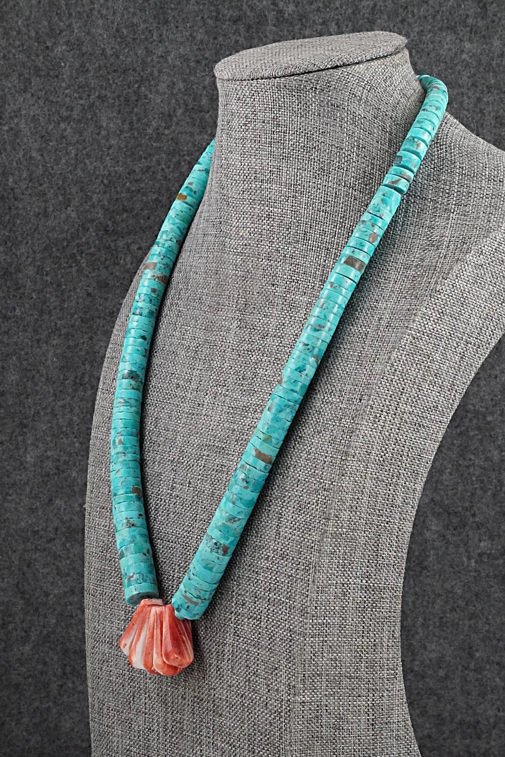 This remarkable beaded turquoise, spiny oyster and sterling silver necklace was finely crafted by Santo Domingo artisan Lupe Lovato.